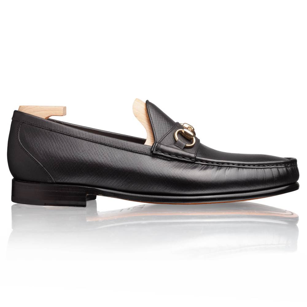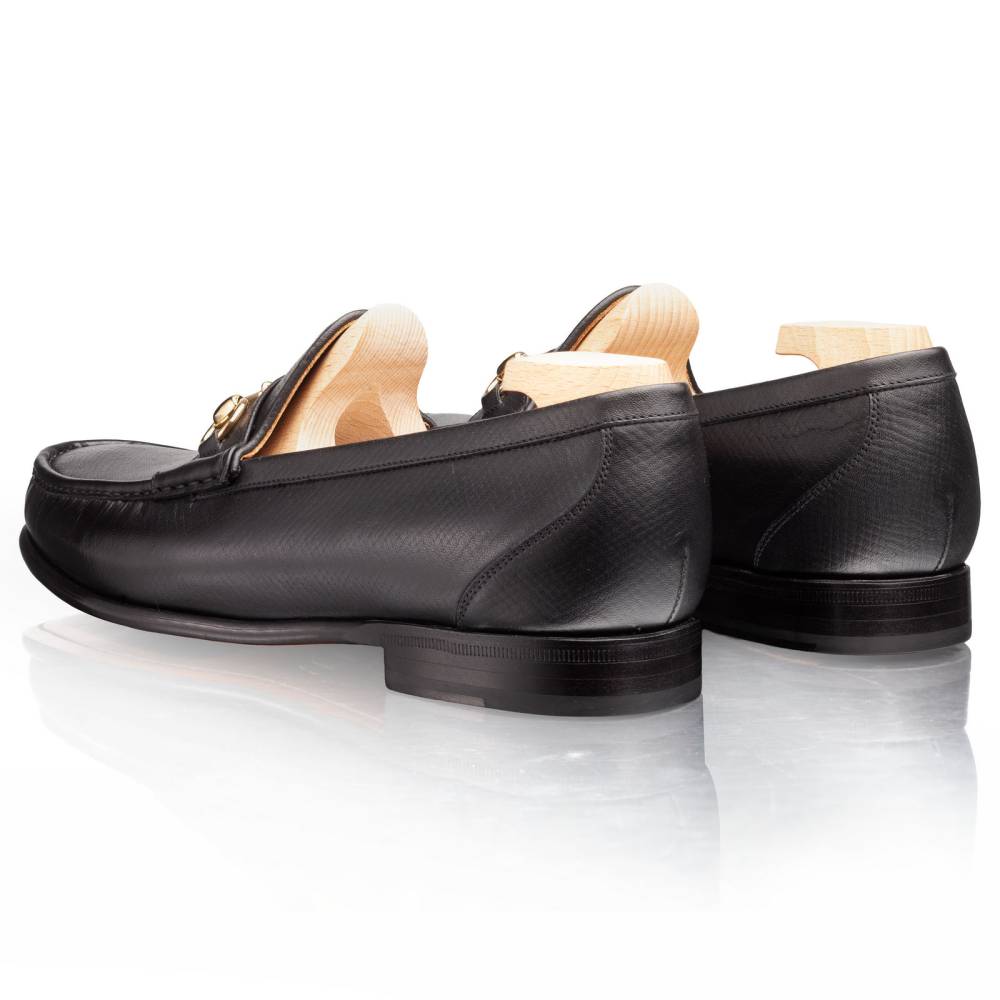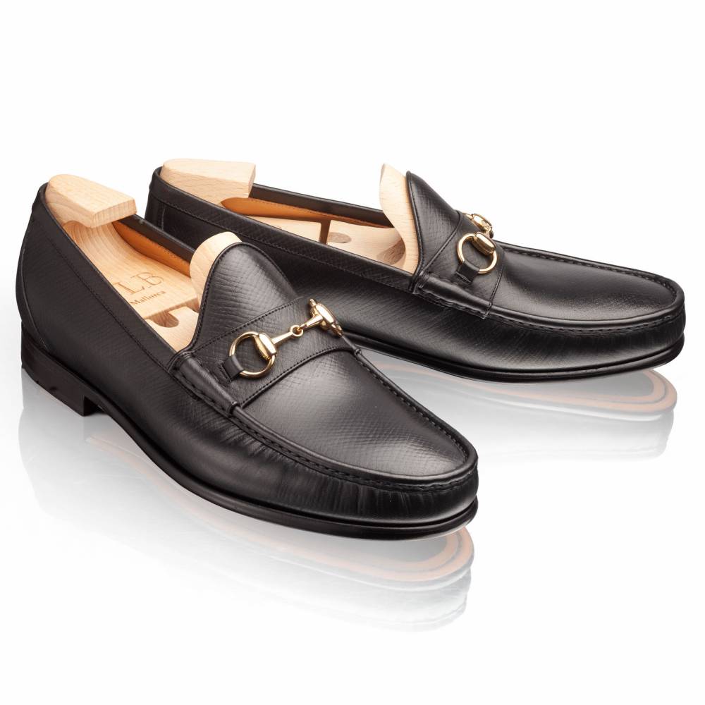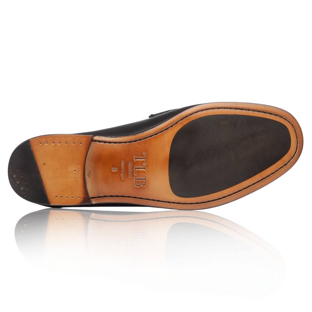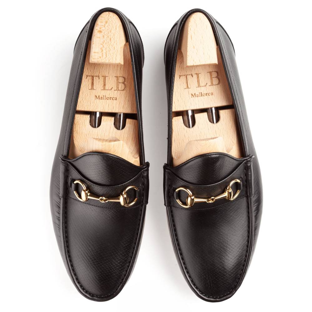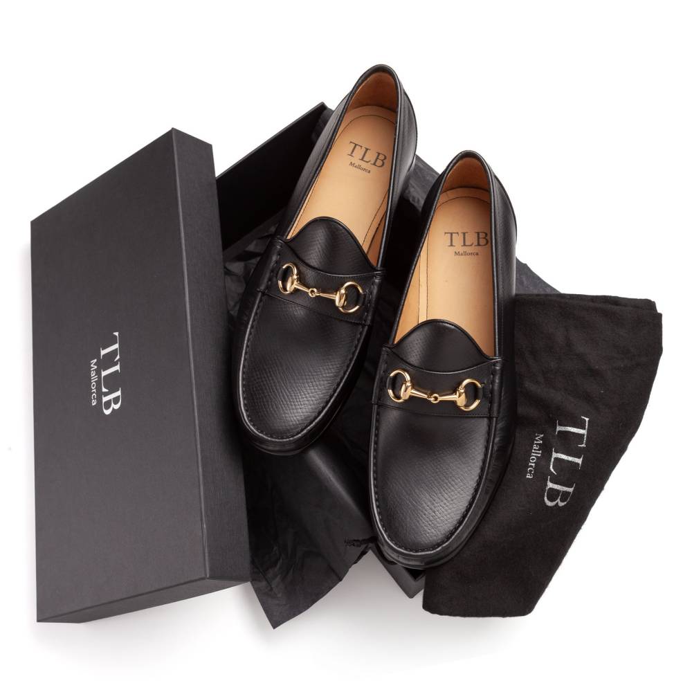 Облегчённые мягкие лоферы Kiowa испанской марки TLB Mallorca на кожаной подошве с резиновой вставкой. Верх сшит вручную из высококачественной телячьей кожи чёрного цвета с выраженными продольными полосами. Такая фактура имитирует вид знаменитой оленьей кожи (юфть, русская кожа), которую производили в Российской империи и очень ценили в Европе. Внутренняя отделка — из тонкой телячьей кожи растительного дубления. Резиновая вставка на подошве обеспечивает отличное сцепление с поверхностью и сохраняет её от истирания. Модель украшена металлической пряжкой в форме удил. Конструкция Blake.