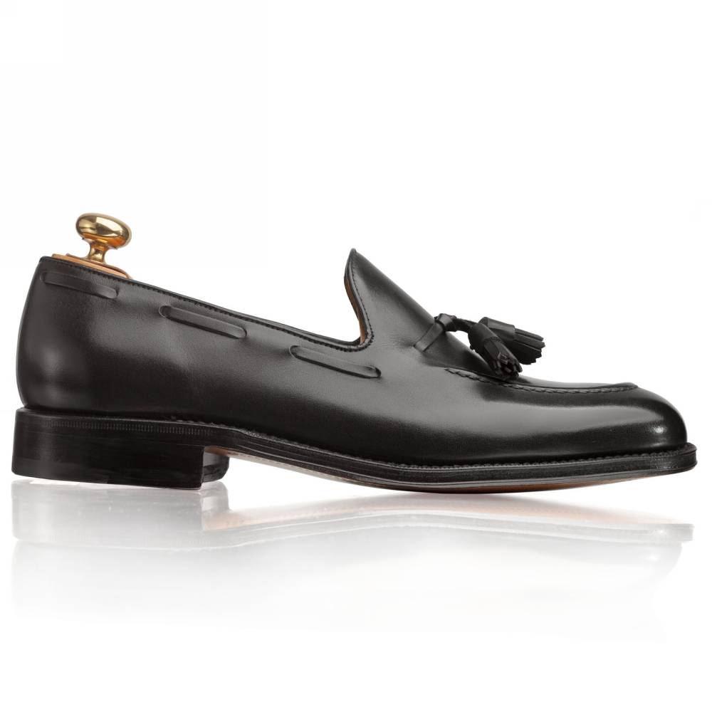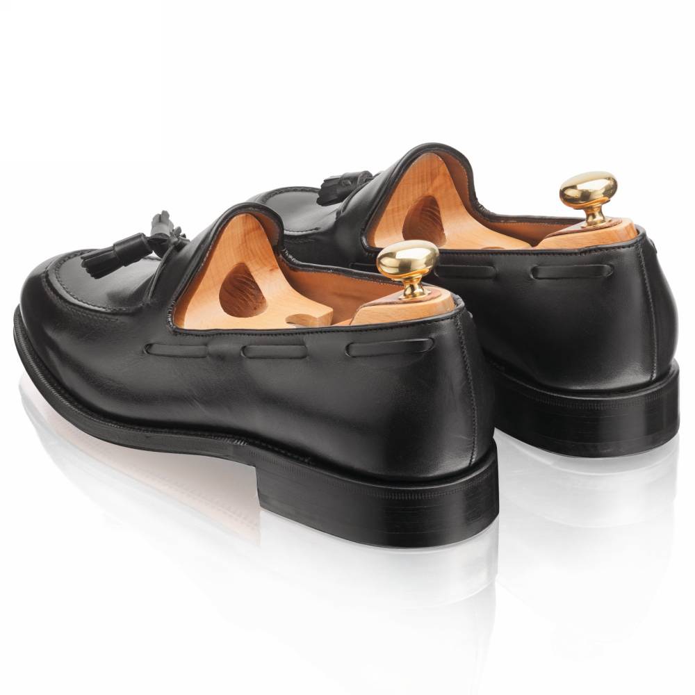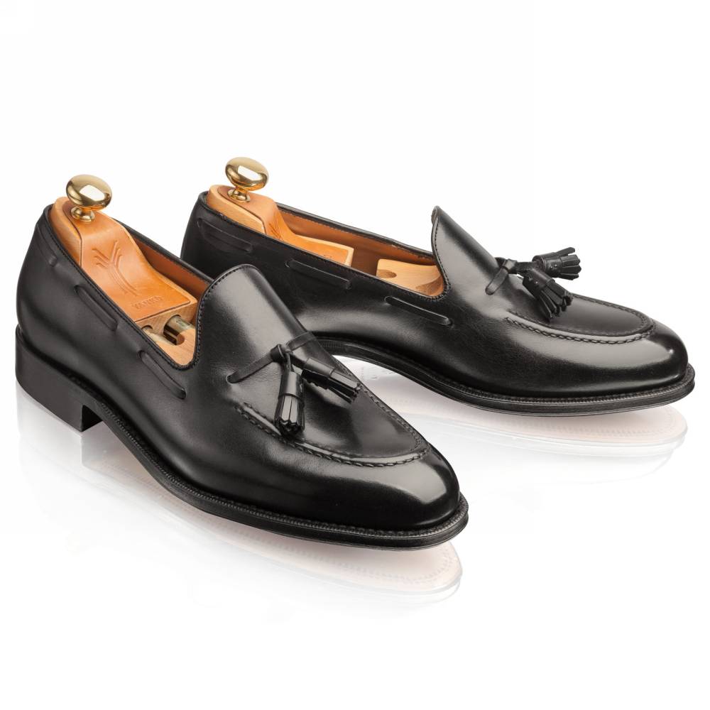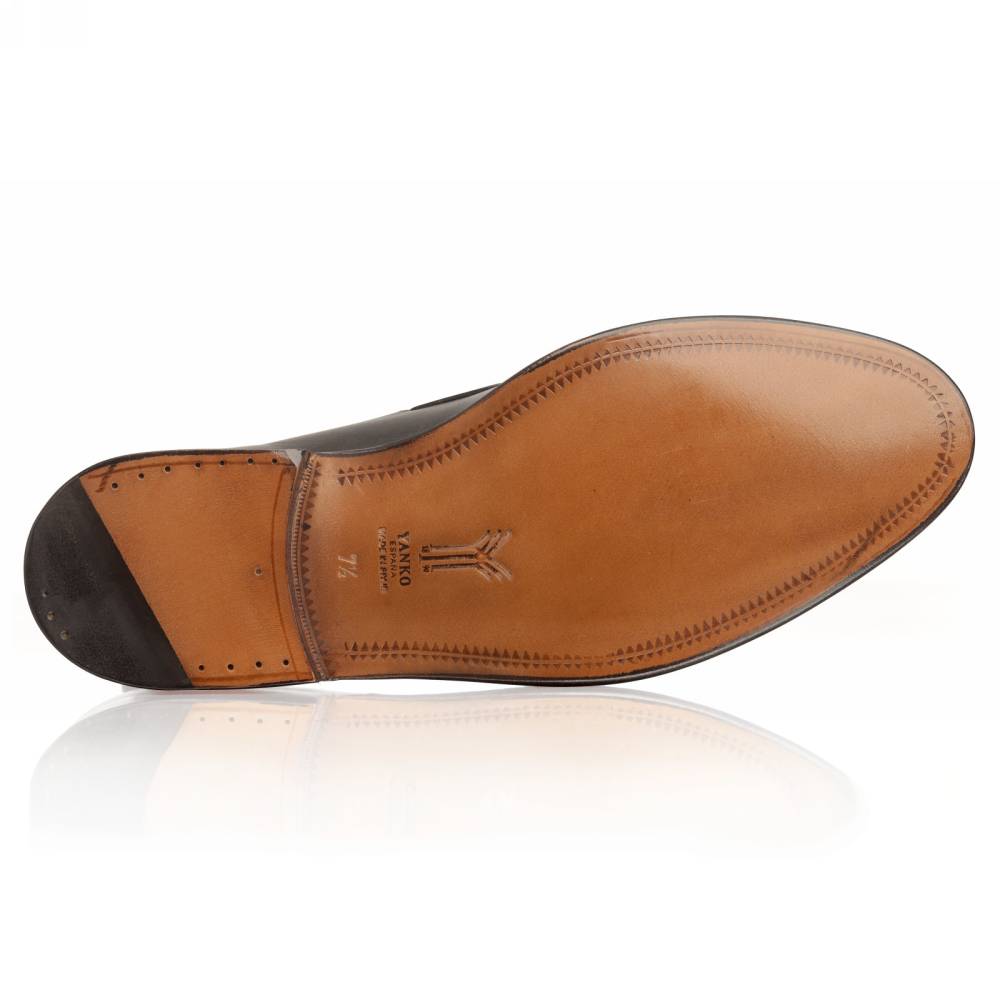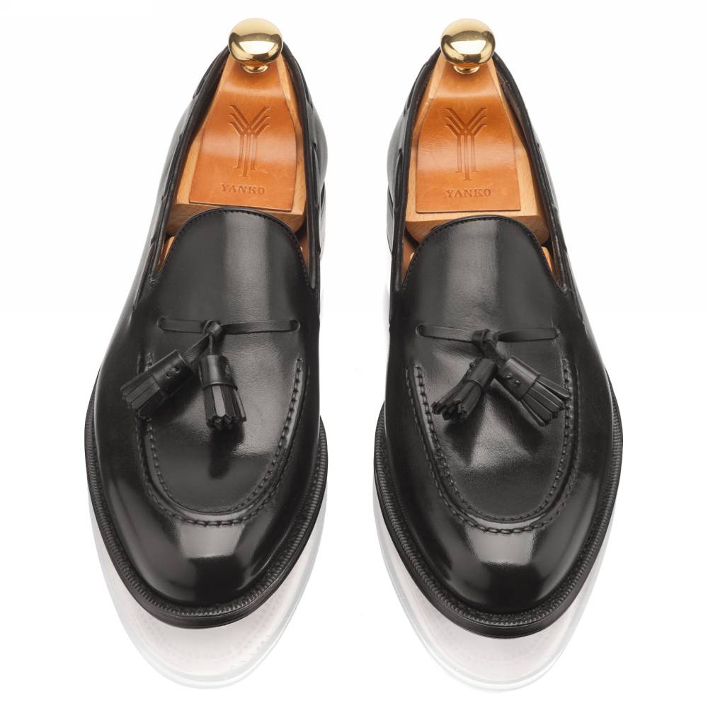 Культовая модель лоферов с кисточками (tassel loafers) чёрного цвета из коллекции испанского бренда Yanko. Верх выполнен из плотной гладкой телячьей кожи. Внутренняя отделка из тонкой бежевой кожи. Область пятки с внутренней стороны с шероховатой поверхностью, чтобы стопа лучше фиксировалась. Шов на подошве закрыт. Это делает её гладкой, а также защищает от проникновения влаги. Конструкция Goodyear Welted.