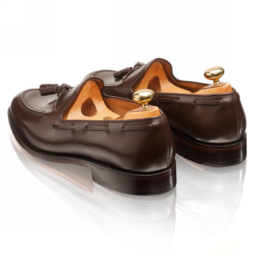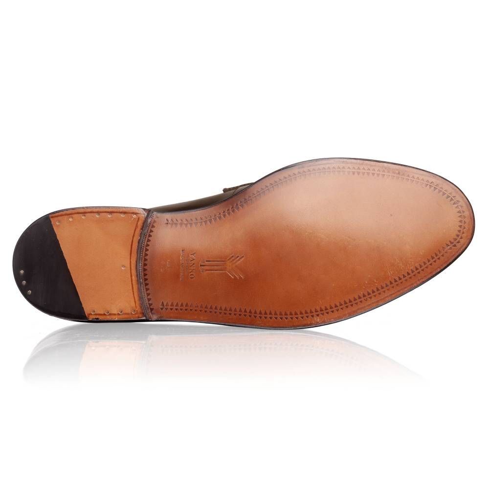 Элегантные мужские лоферы с кисточками (tassel loafers) испанского бренда Yanko на кожаной подошве с закрытым швом. Верх выполнен из гладкой телячьей кожи тёмно-коричневого цвета. Внутренняя отделка из тонкой бежевой кожи растительного дубления. Область пятки с внутренней стороны с шероховатой поверхностью, чтобы стопа лучше фиксировалась. Конструкция Goodyear Welted.
