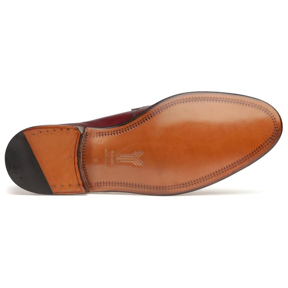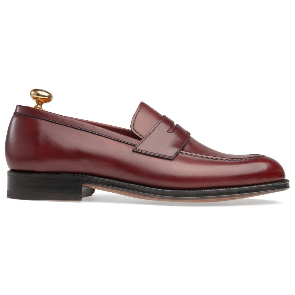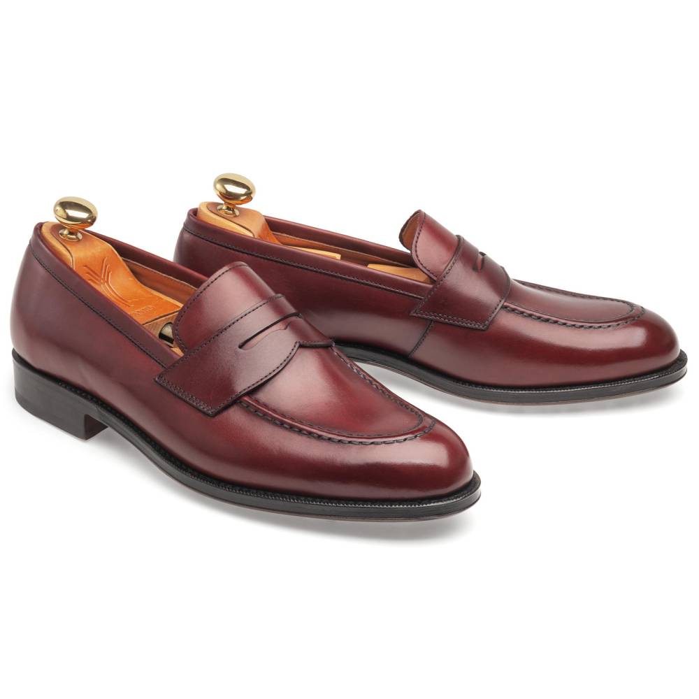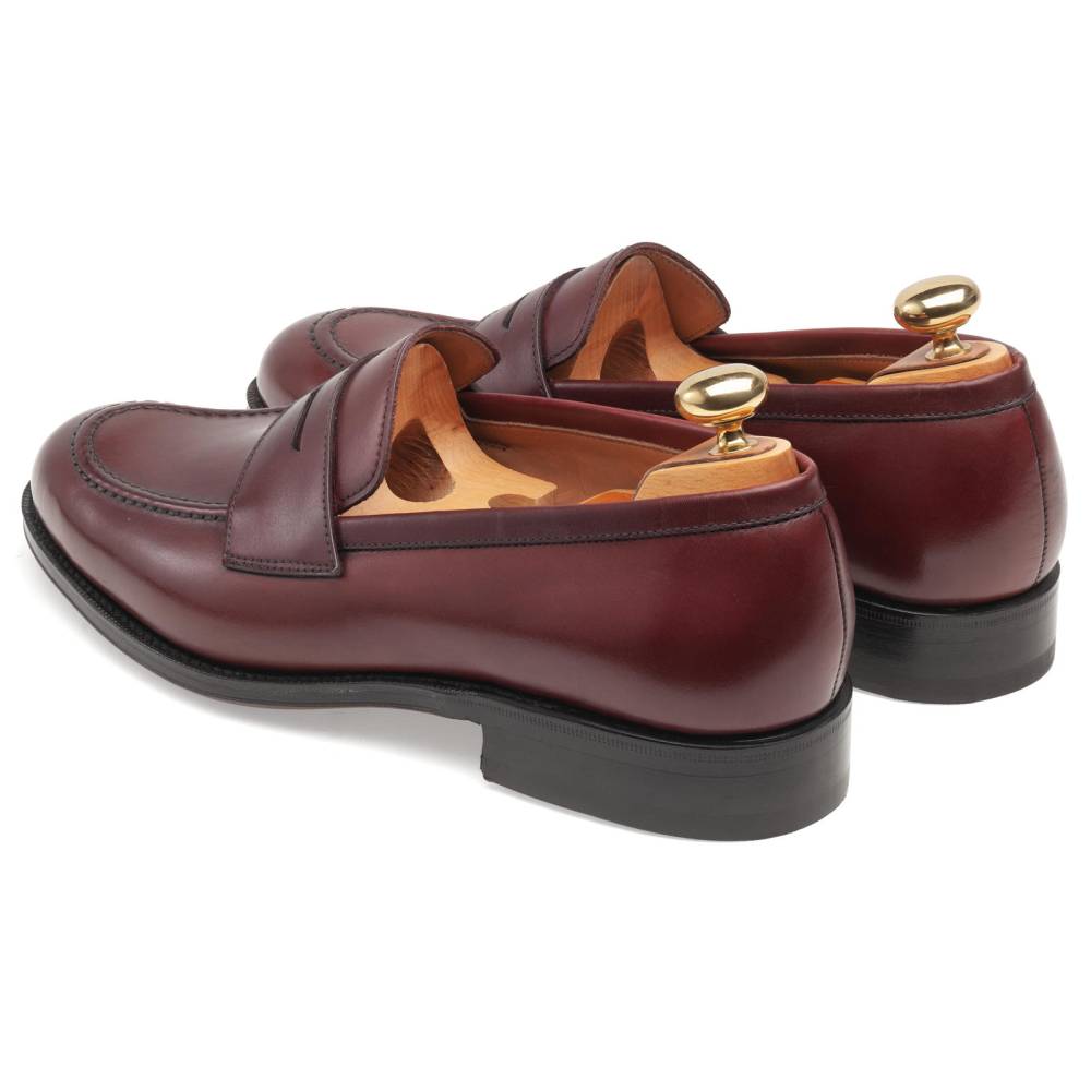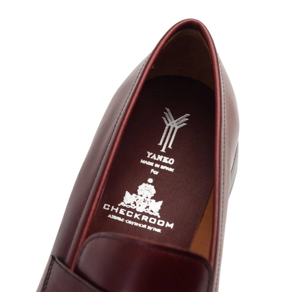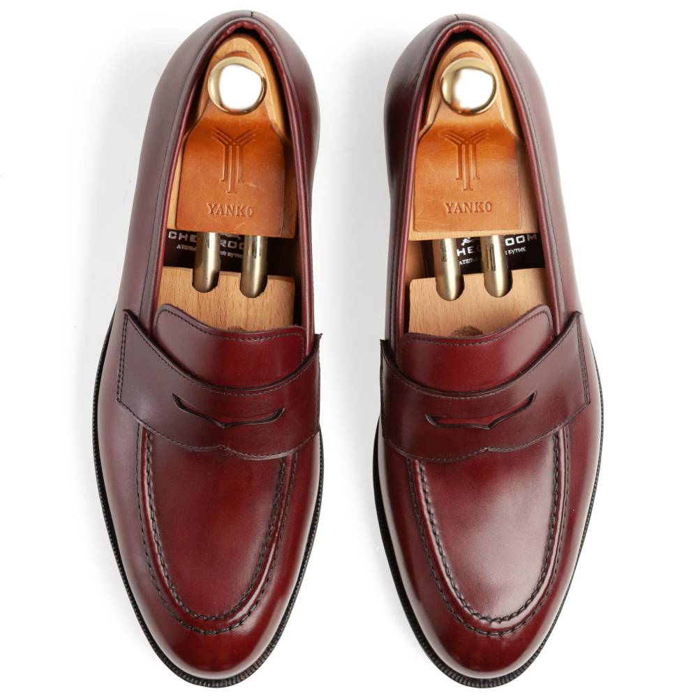 Мужские пенни-лоферы испанского бренда Yanko на кожаной подошве выполнены по заказу магазина Checkroom. Верхняя часть из высококачественной телячьей кожи бордового цвета. Внутренняя отделка из тонкой бежевой кожи. Область пятки с внутренней стороны из замши. Шов на подошве закрыт. Это делает её гладкой, а также защищает от прникновения влаги. Конструкция Goodyear Welted.