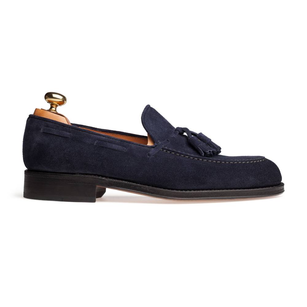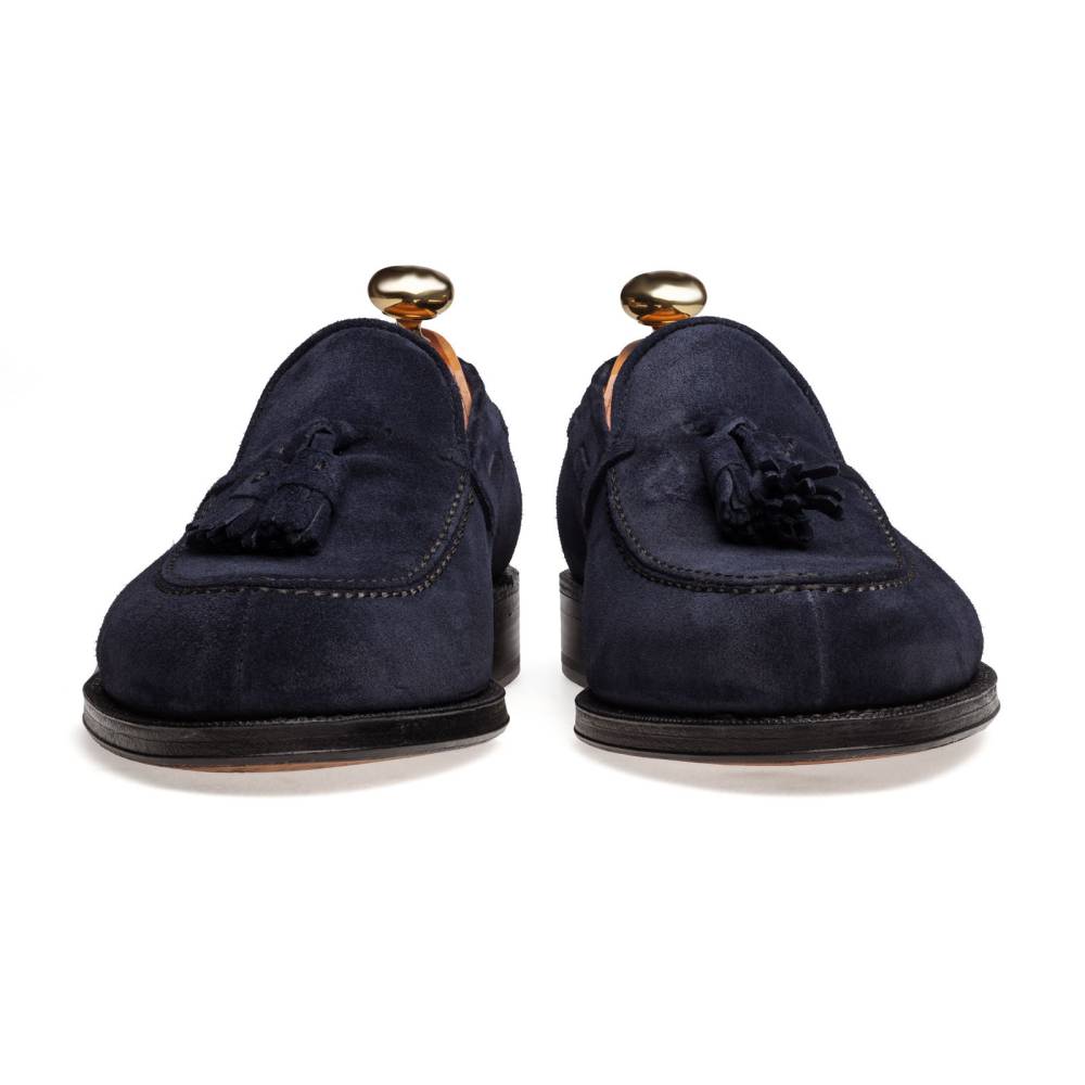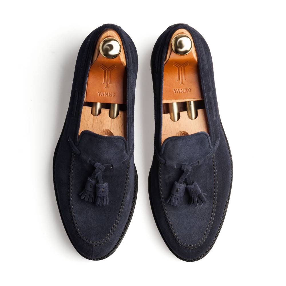 Элегантные мужские лоферы от испанской фабрики Yanko. Модель представляет собой лоферы в норвежском стиле с тремя сшитыми элементами в передней части (split toe). Для верха используется мягкая и бархатистая замша. На подъёме лоферы украшены кисточками. Внутренняя отделка из тонкой кожи горчичного оттенка. Конструкция Goodyear Welted.