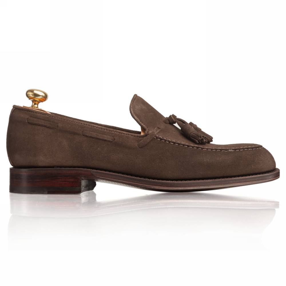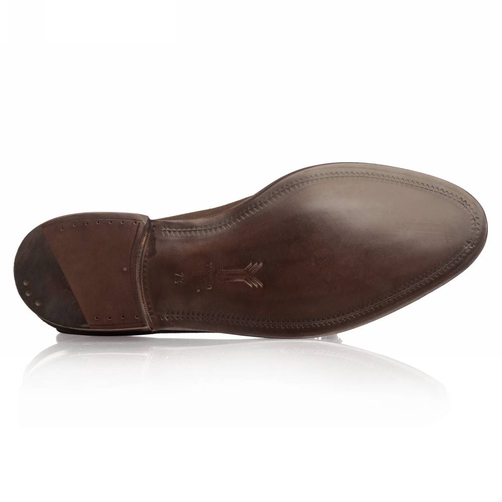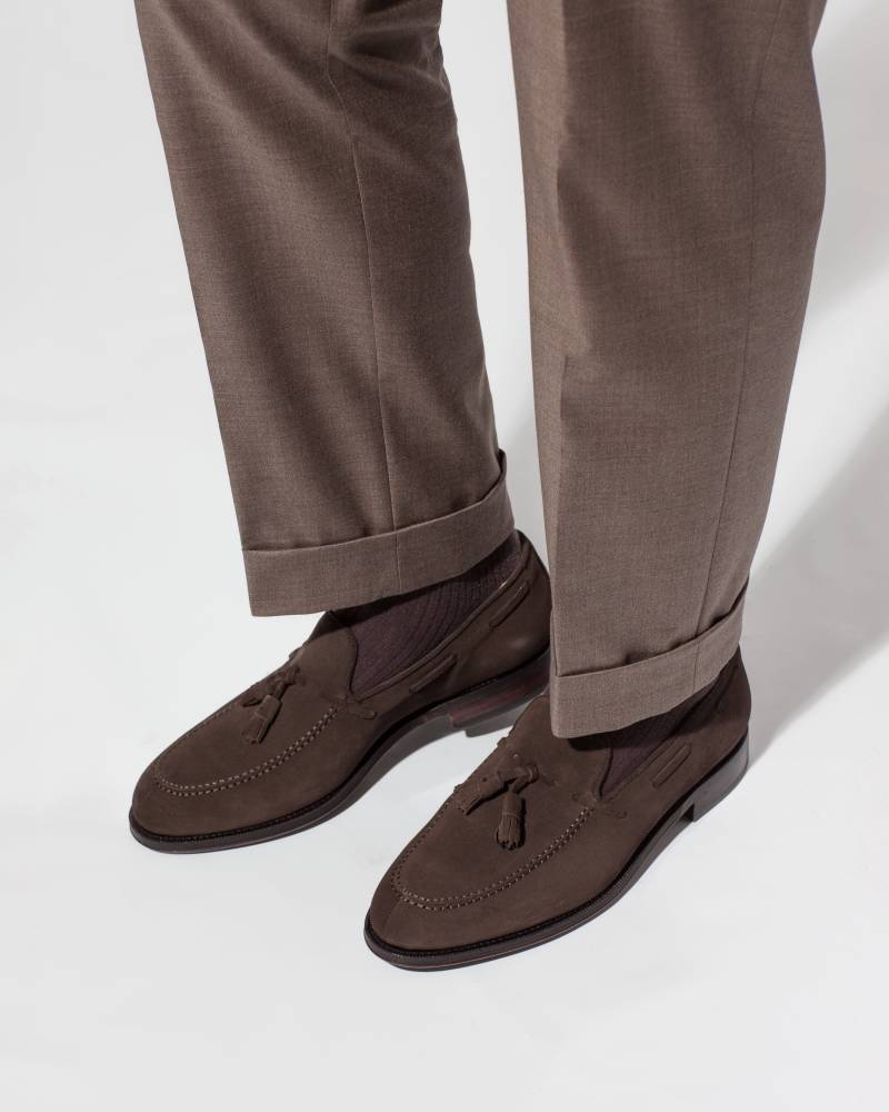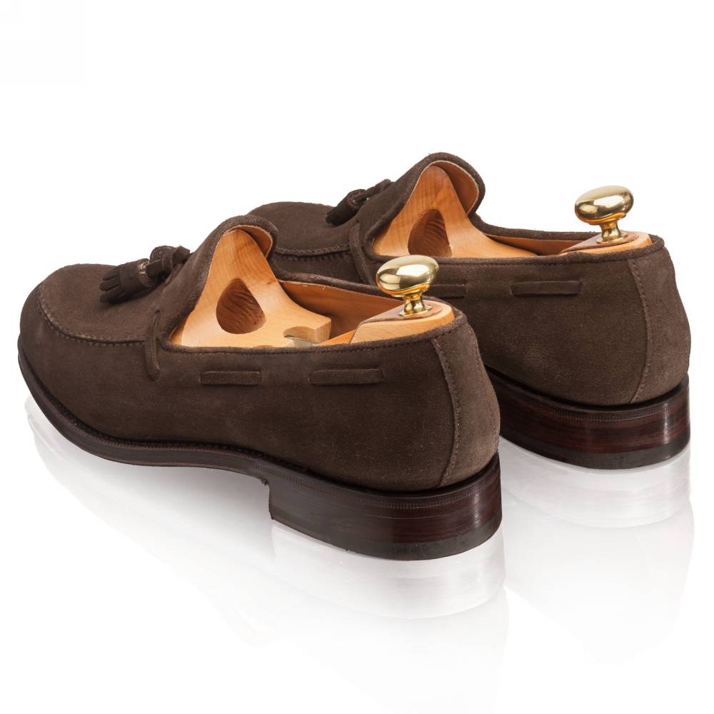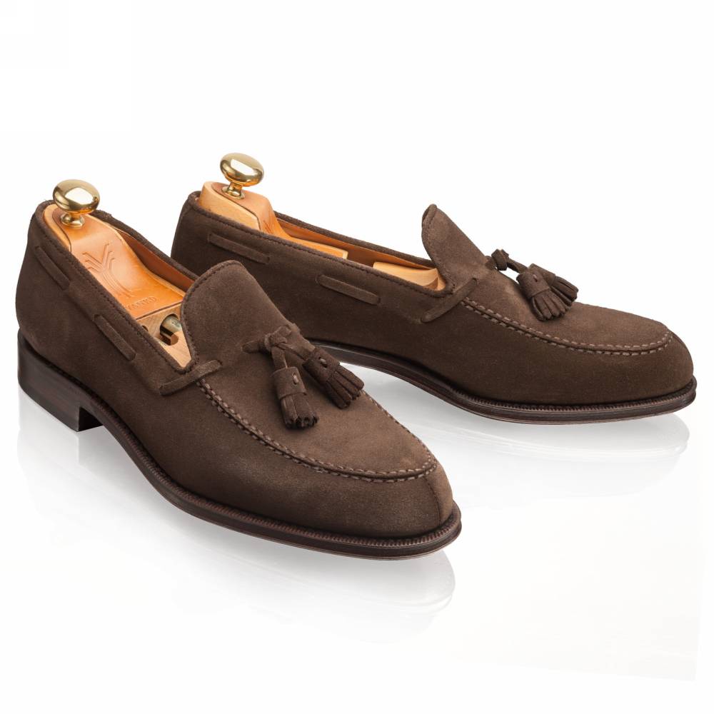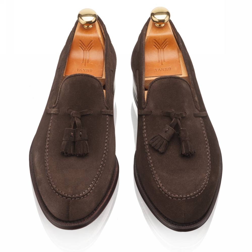 Элегантные мужские лоферы от испанской фабрики Yanko на кожаной подошве. Модель представляет собой лоферы в норвежском стиле с тремя сшитыми элементами в передней части (split toe). Для верха используется мягкая и бархатистая замша. На подъёме лоферы украшены кисточками. Внутренняя отделка из тонкой кожи растительного дубления горчичного оттенка. Шов на подошве закрыт. Это делает её гладкой, а также защищает от проникновения влаги. Конструкция Goodyear Welted.