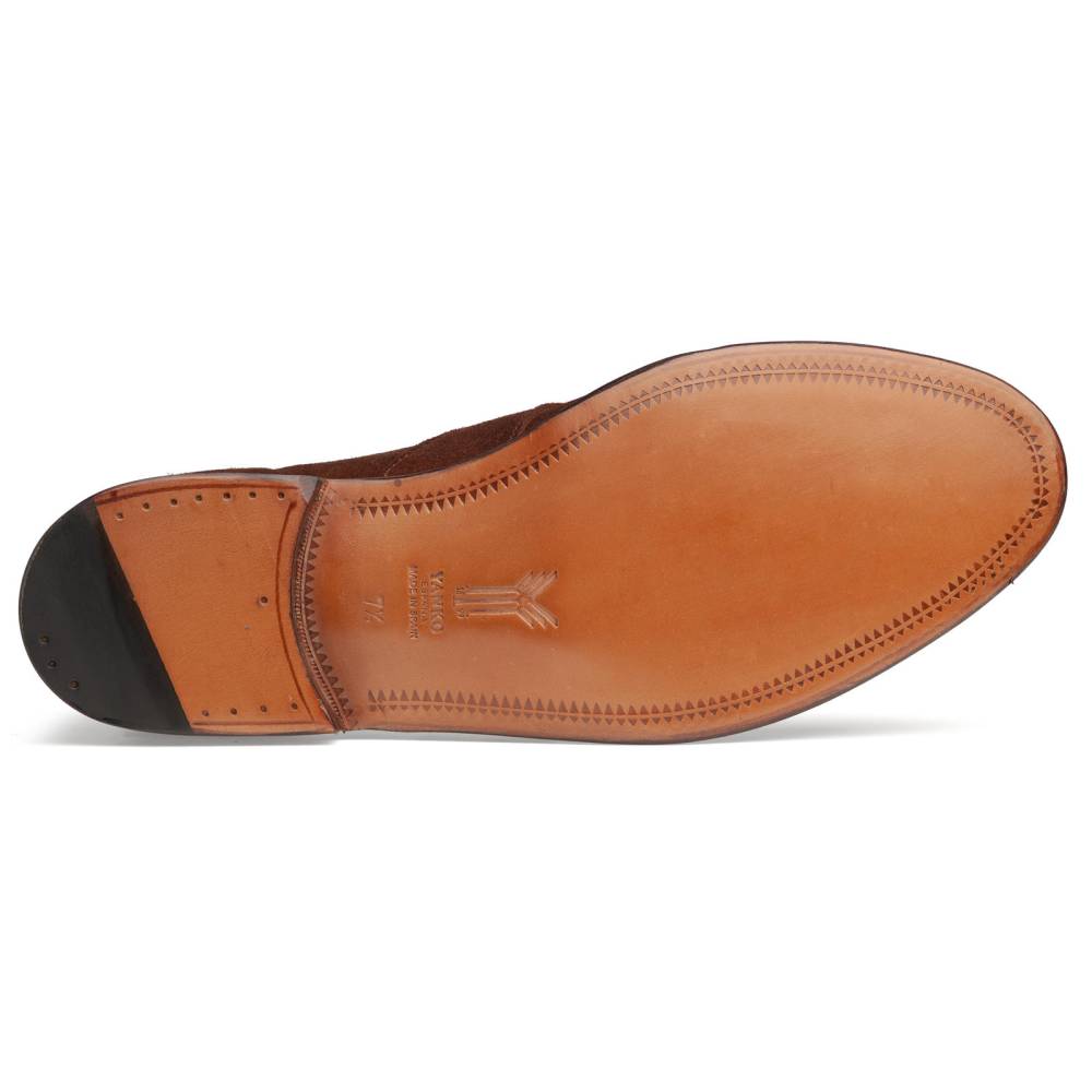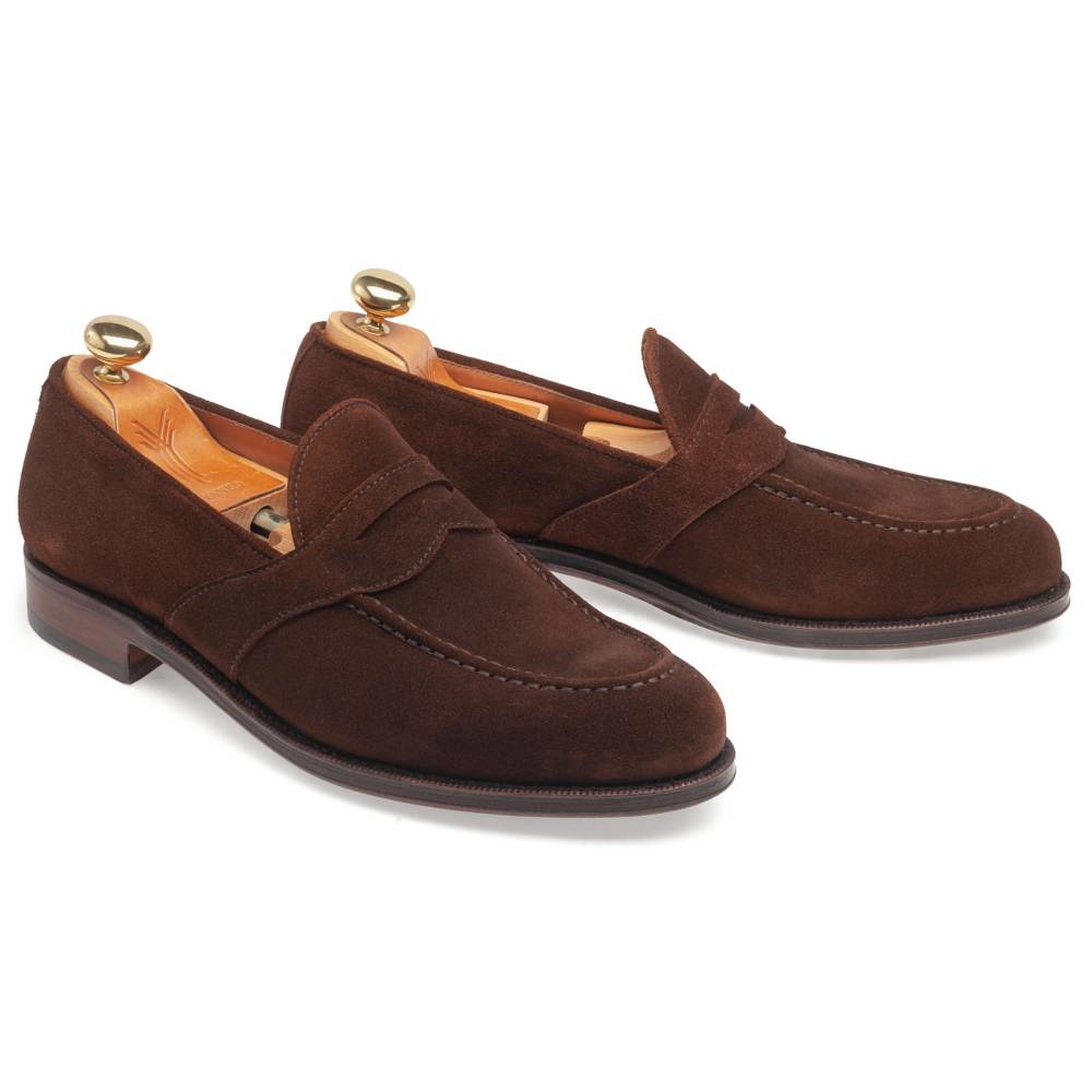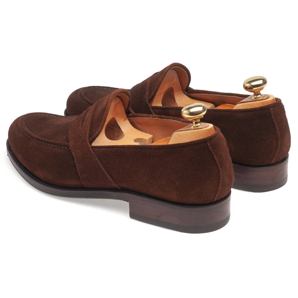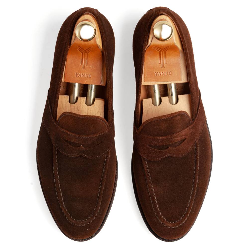 Классические коричневые пенни-лоферы испанского бренда Yanko сшиты по специальному заказу бутика Checkroom. Отличительной особенностью данной модели является полный «поясок», который огибает центральную часть обуви. Верх выполнен из мягкой замши, а подошва — из износостойкой кожи. Шов на подошве закрыт. Это делает её гладкой, а также защищает от проникновения влаги. Внутренняя отделка из тонкой бежевой кожи. Область пятки с внутренней стороны из замши. Конструкция Goodyear Welted.