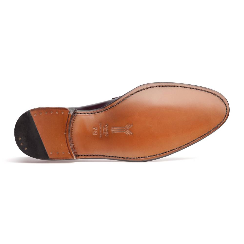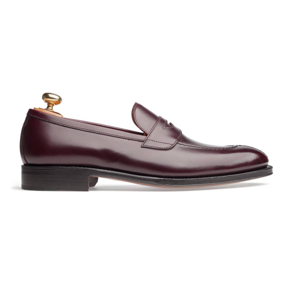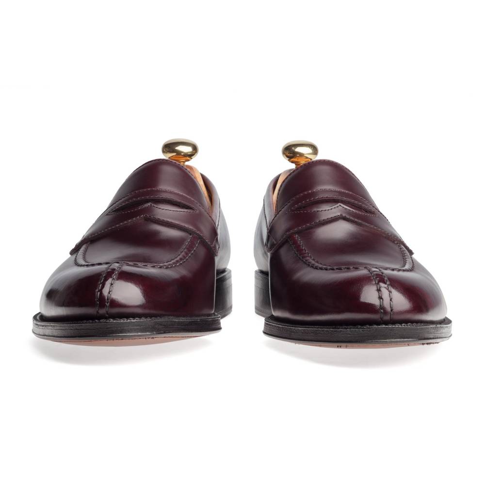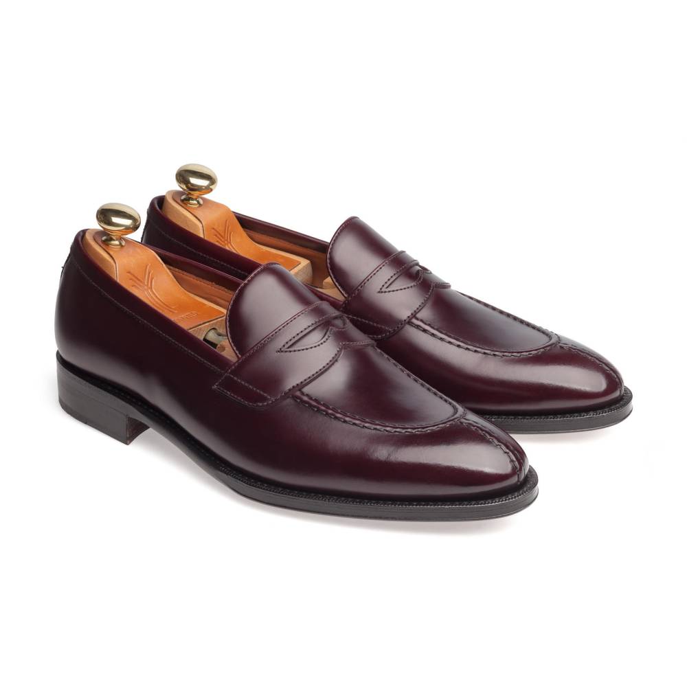 Мужские пенни-лоферы испанского бренда Yanko из полированной телячьей кожи бордового цвета. Подкладка выполнена из тонкой светло-коричневой кожи. Характерной чертой модели является норвежский мыс (split toe), состоящий из трёх частей. Такая форма мыса нечасто встречается на лоферах и придаёт модели неофициальный, расслабленный внешний вид. Конструкция Goodyear Welted.