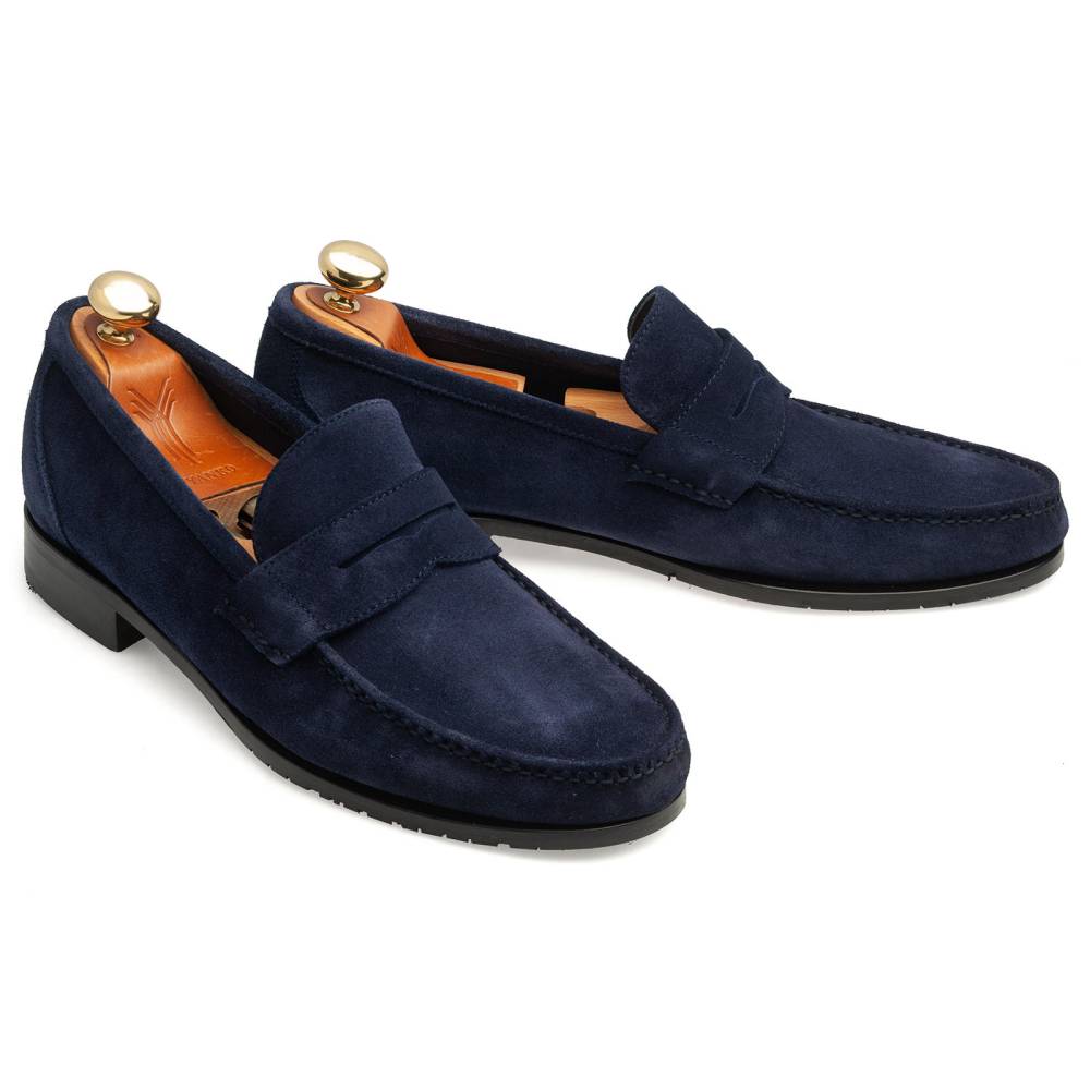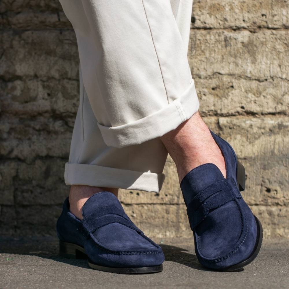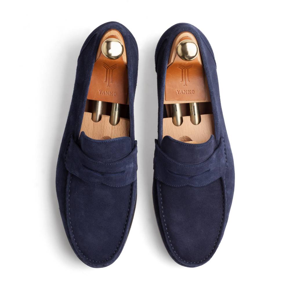 Лёгкие и удобные мужские пенни-лоферы испанского бренда Yanko из тёмно-синей замши для жаркой погоды. Летняя обувь для отдыха и прогулок должна особенно хорошо «дышать» и быть как можно легче. Поэтому данная модель по заказу Checkroom была изготовлена в облегчённой конструкции Blake без подкладки. Эти особенности делают её гибче и позволяют лучше облегать стопу. Для подошвы специально была выбрана тонкая гибкая резина, с расчётом на то, что она защитит от проникновения влаги снизу в дождливую погоду.
