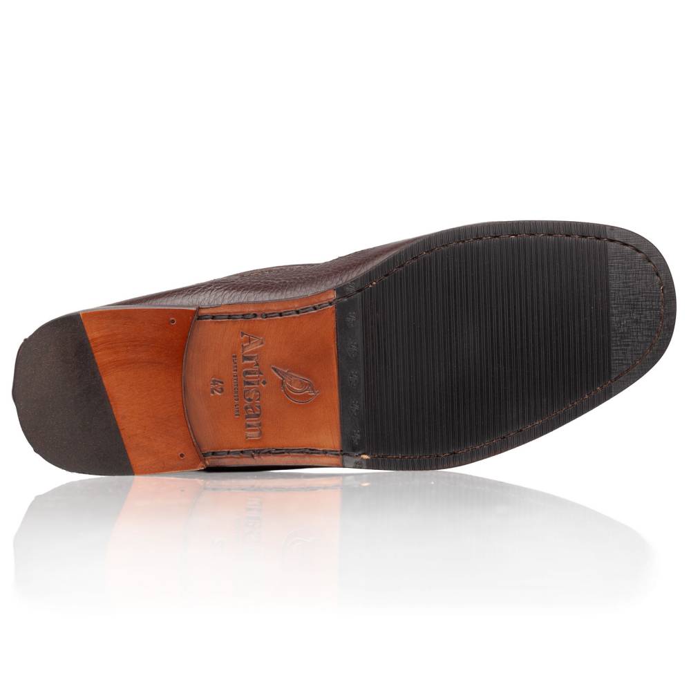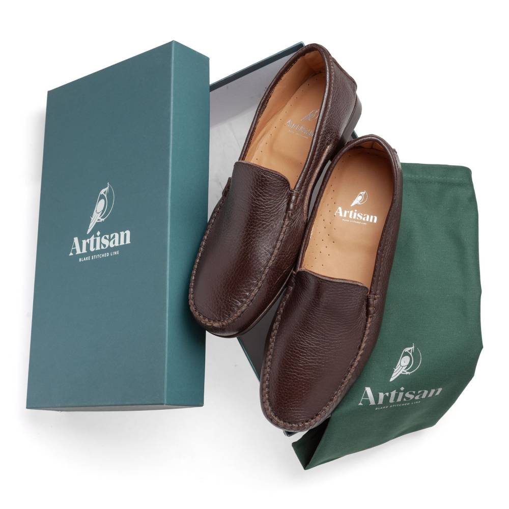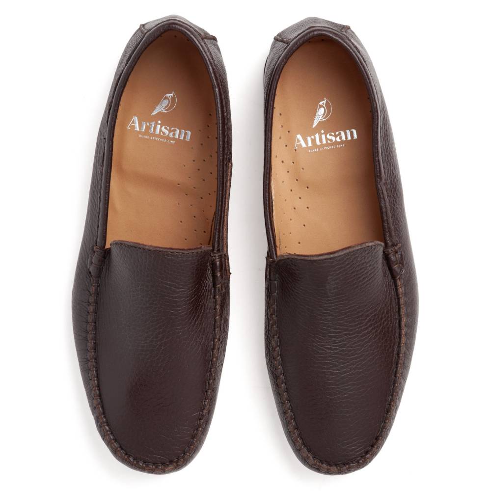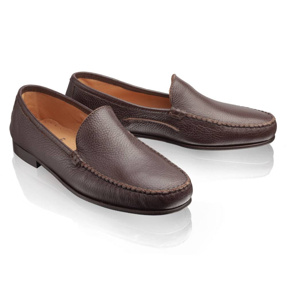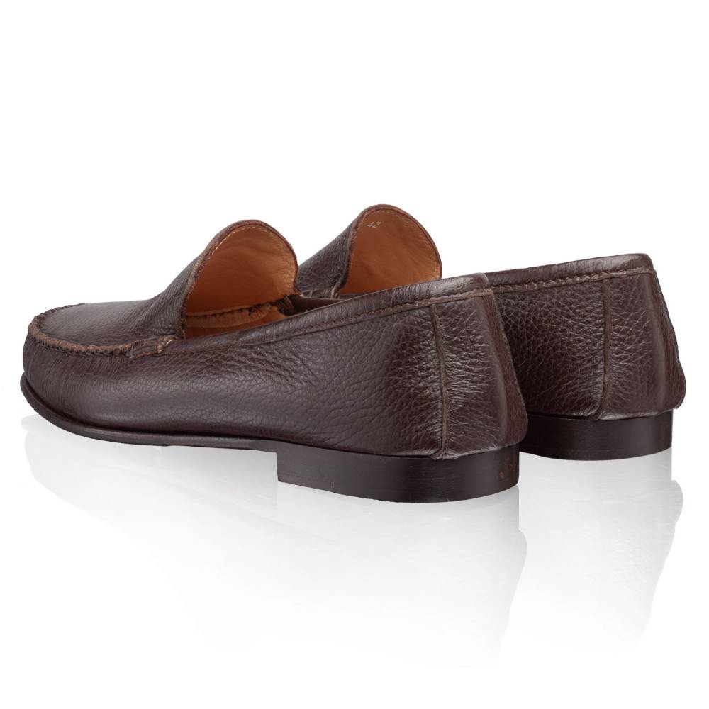 Лаконичные удобные мокасины Simone бренда Artisan на тонкой кожаной подошве с каблуком и резиновой профилактикой. Верх выполнен из мягкой приятной на ощупь оленьей кожи тёмно-коричневого цвета с зернистой фактурой. Внутри тонкая подкладка из кожи растительного дубления. Конструкция Blake/Tubular. Благодаря такой технике кожа полностью проходит под стопой и сшивается в другом месте. В данном случае сбоку. Затем подошва пришивается к верху напрямую. Это добавляет особую мягкость при ходьбе. Мокасинный шов в передней части обуви выполнен вручную.