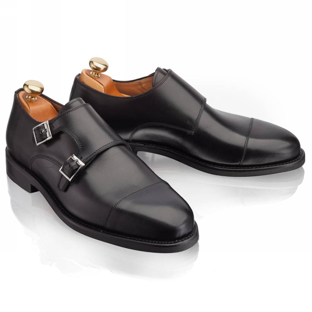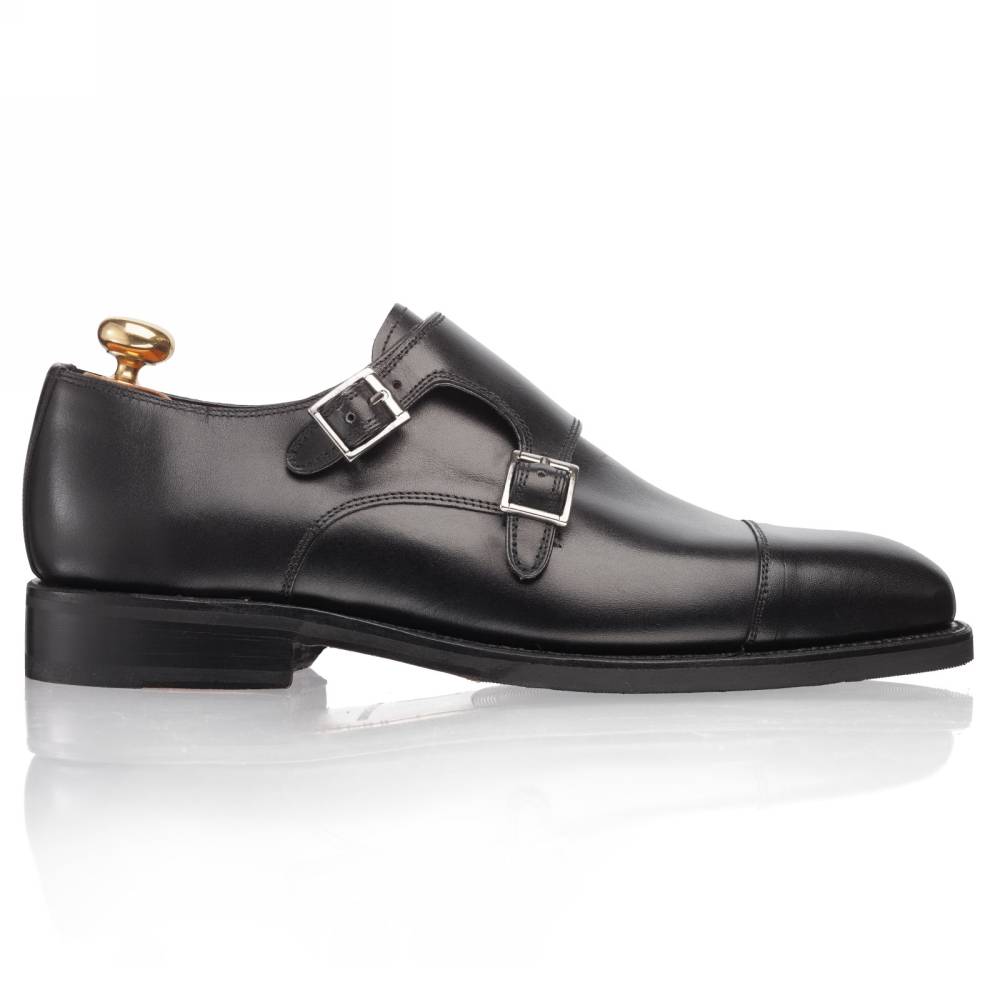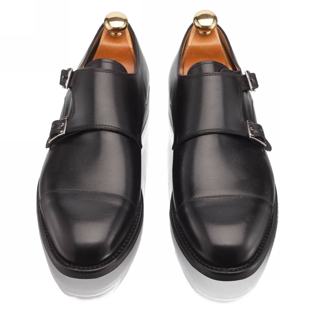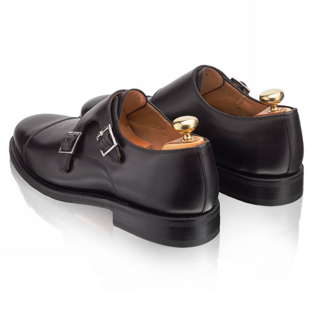 Элегантные мужские туфли-монки Oswald бренда Artisan из гладкой телячьей чёрного цвета. Модель изготовлена по специальному заказу на испанской фабрике Cordwainer в городе Альманса – центре обувной промышленности Испании. Внутренняя отделка из тонкой кожи. Практичная комбинированная подошва, состоящая из кожи и резины. Модель имеет два характерных ремешка со сдержанными квадратными пряжками из серебристого металла. Конструкция Goodyear Welted.