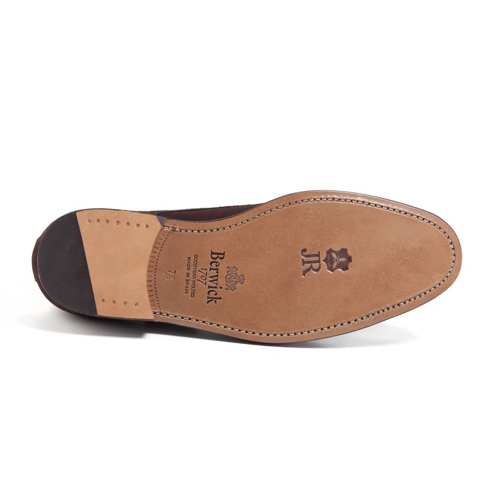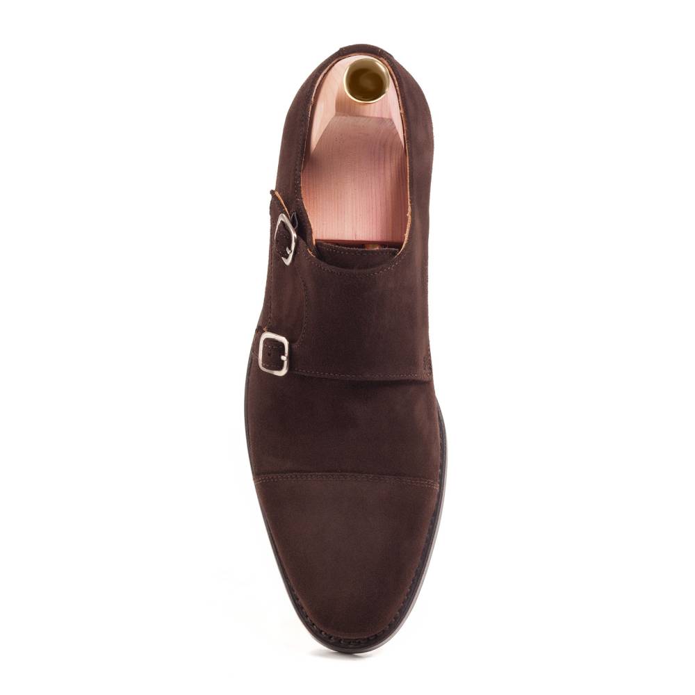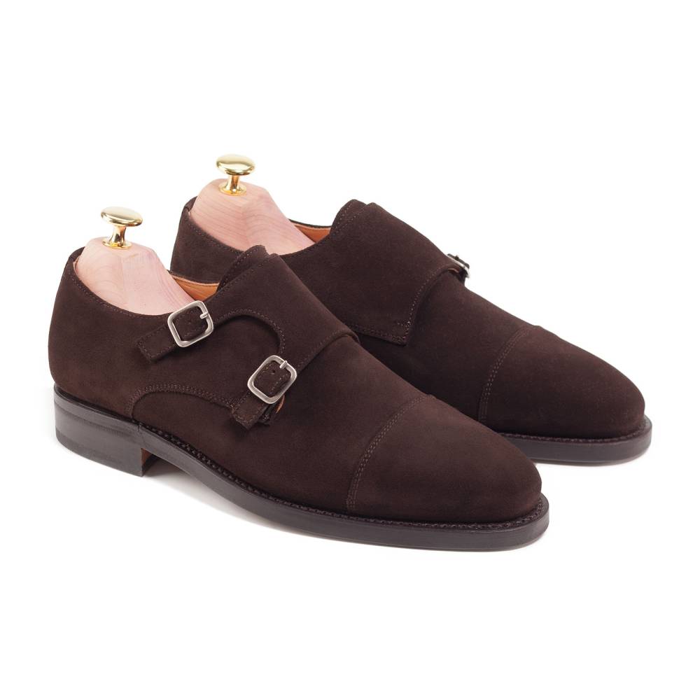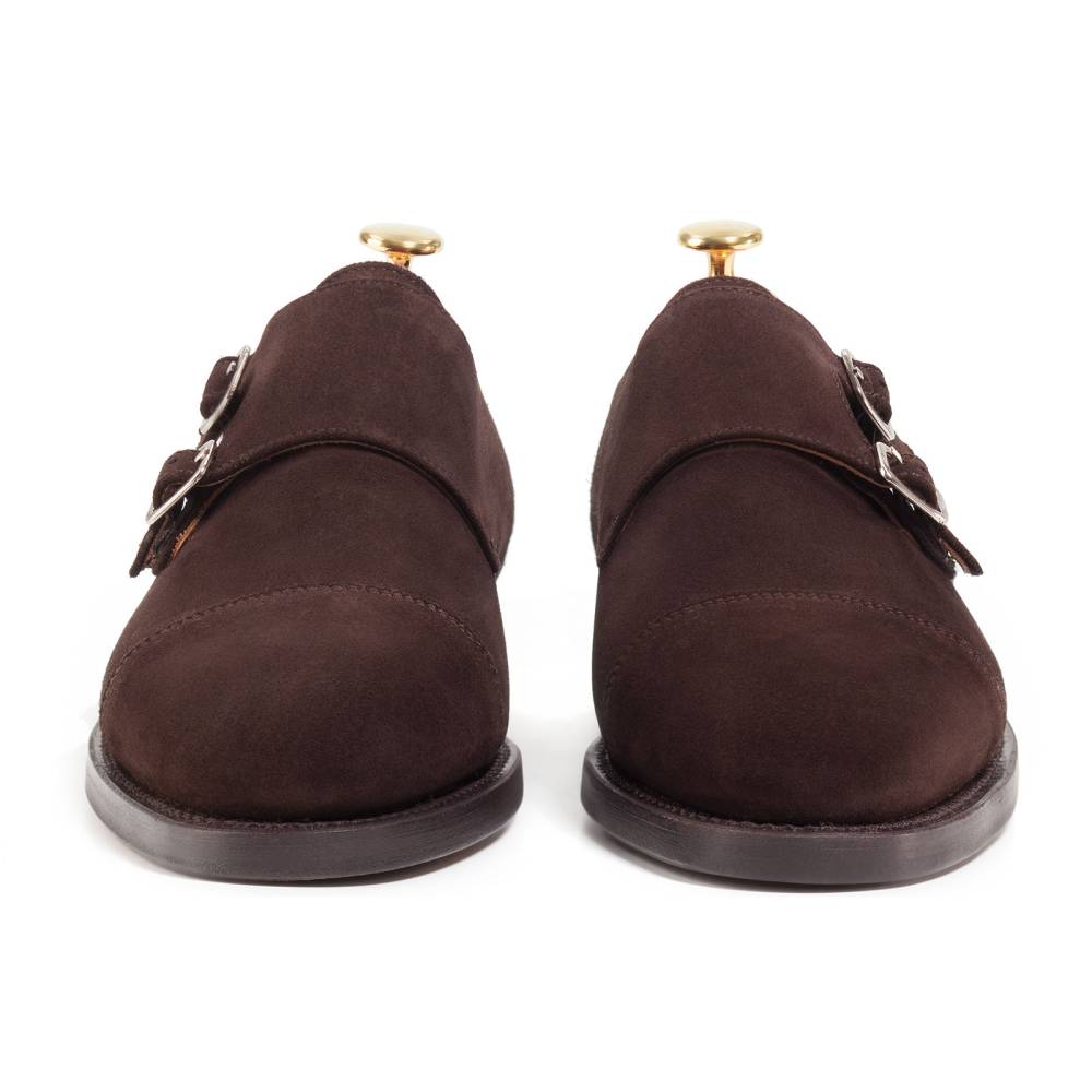Тёмно-коричневые туфли монки Berwick с двойными пряжками. Верх выполнен из высококачественной английской замши с бархатистым ворсом. На обувь установлена двухслойная кожаная подошва от знаменитой немецкой кожевенной мастерской Joh. Rendenbach. Внутренняя отделка из тонкой кожи горчичного оттенка. Конструкция Goodyear.