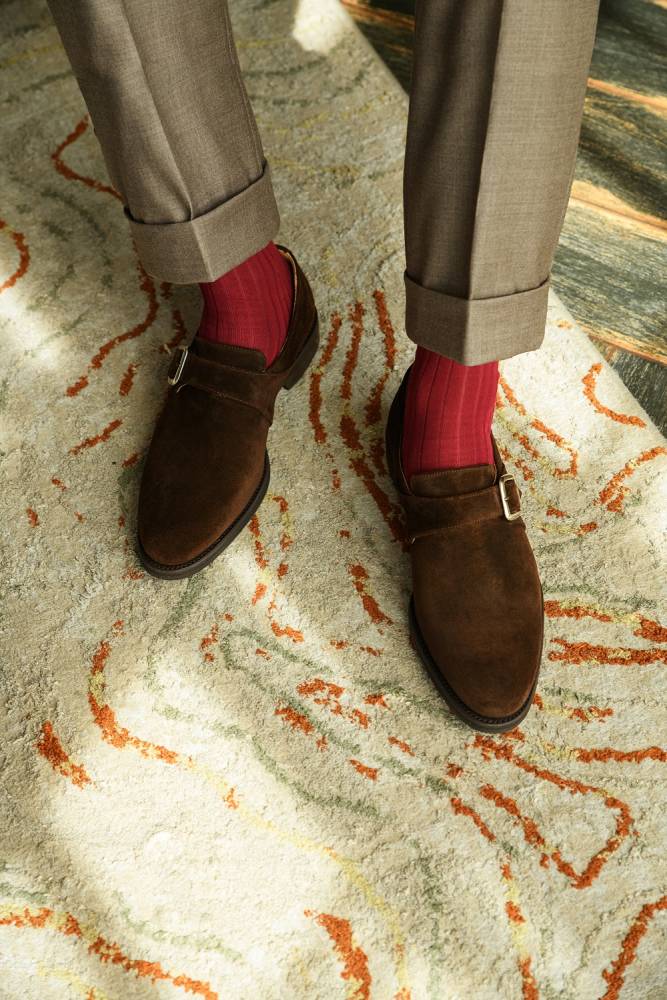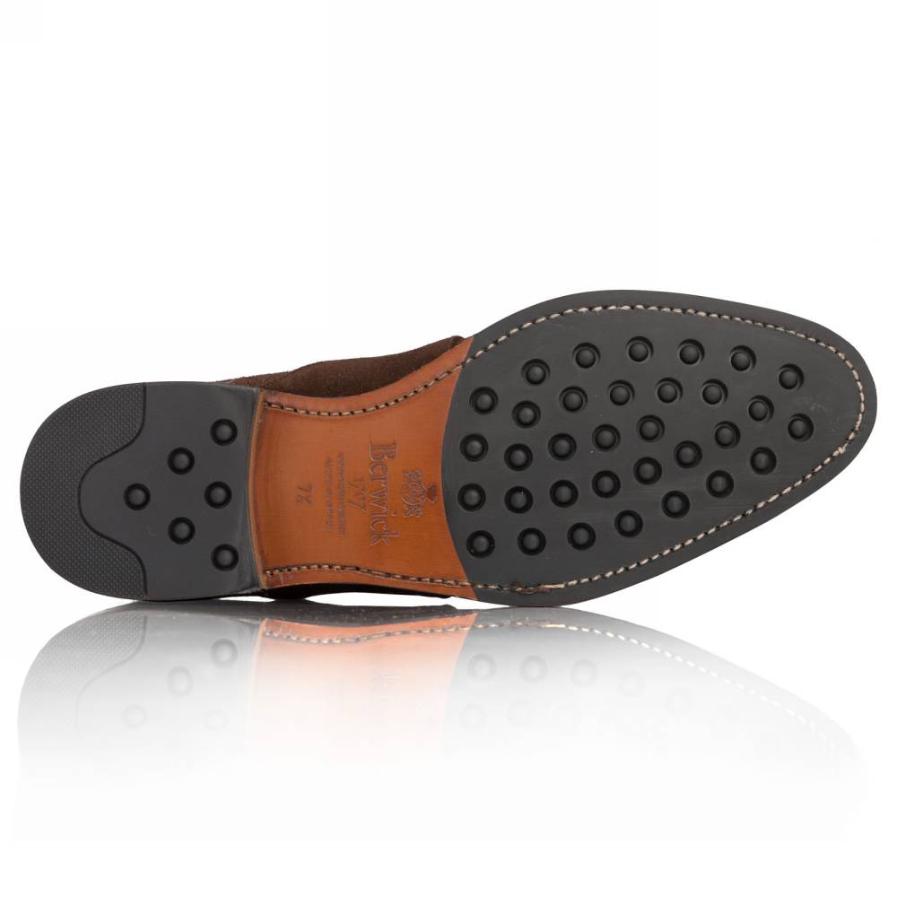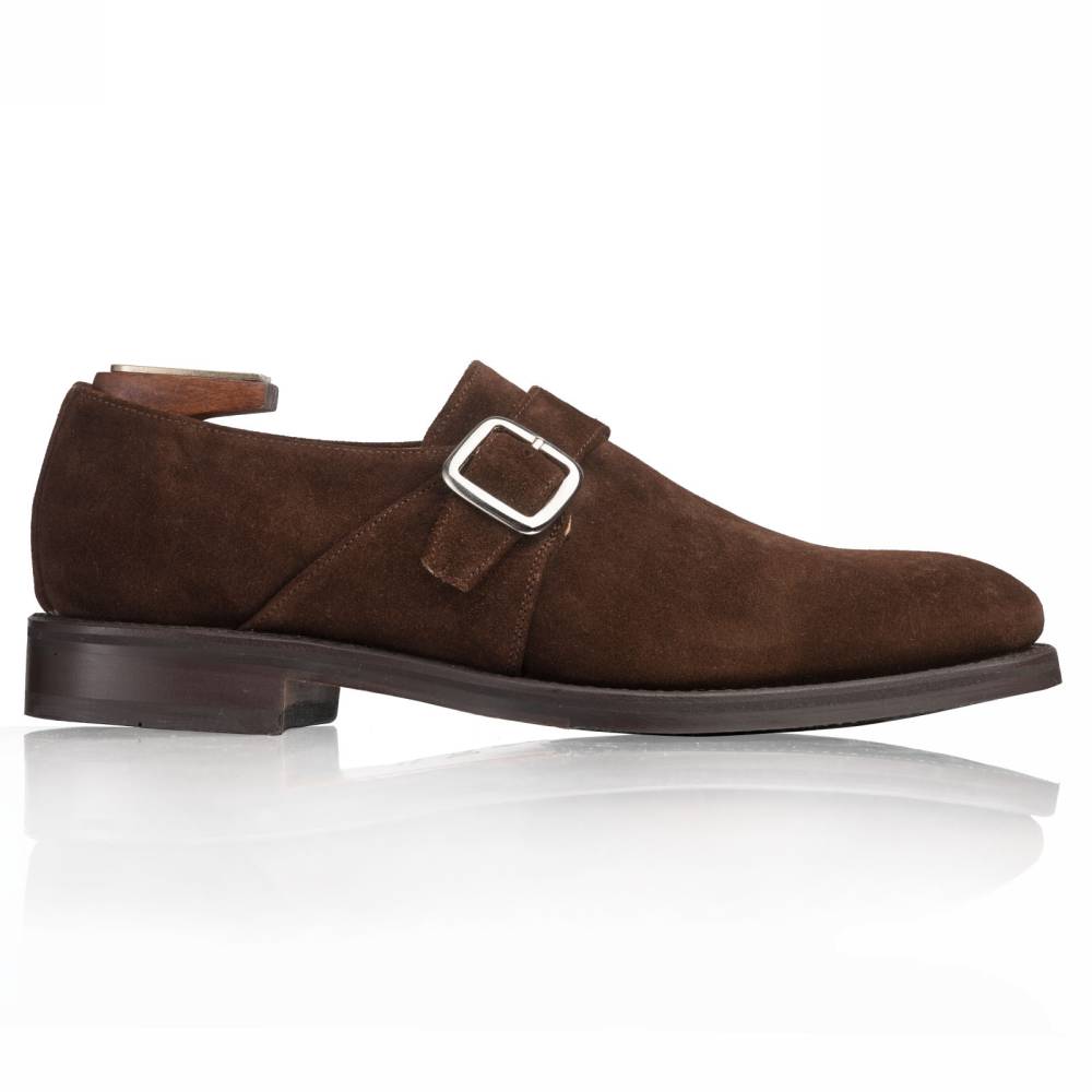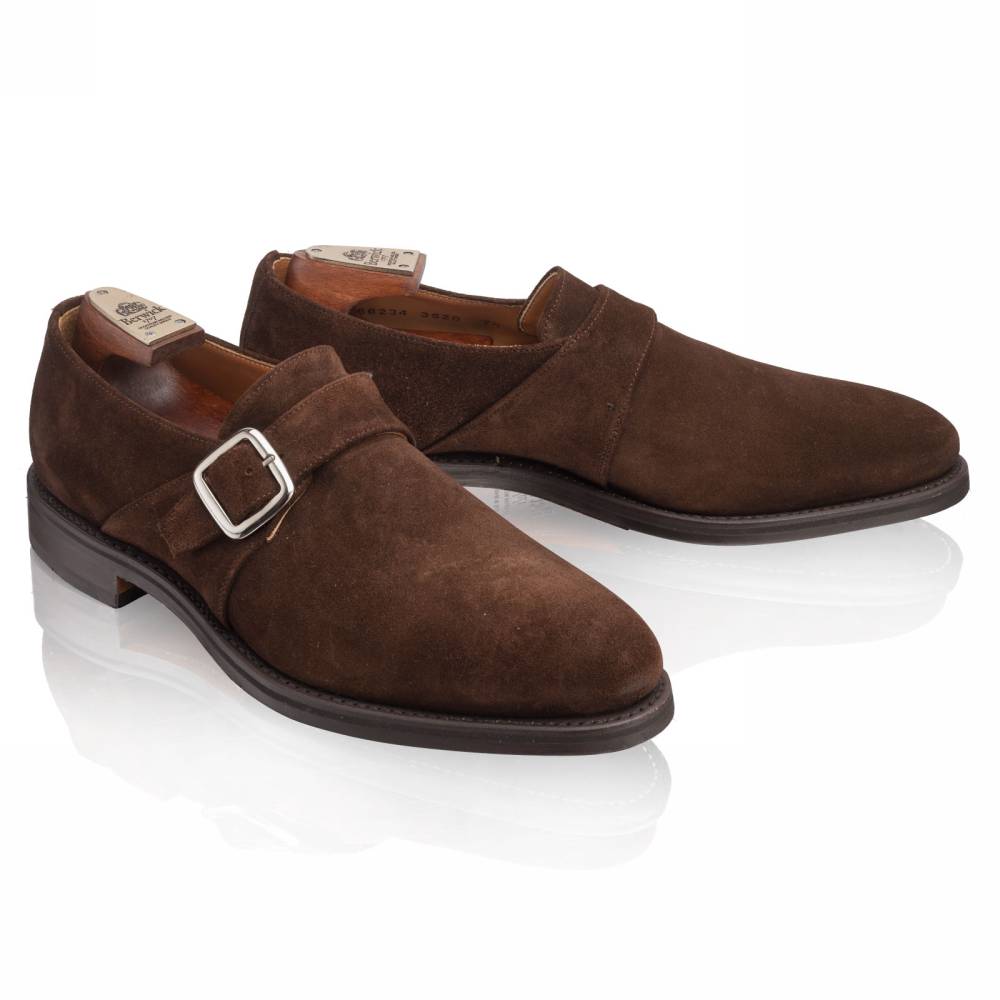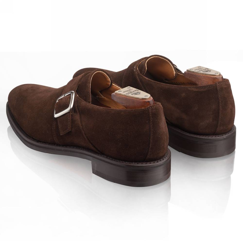 Тёмно-коричневые мужские монки Berwick из высококачественной замши с бархатистым ворсом. Застёгиваются на один ремешок с квадратной пряжкой из полированного металла. Подошва выполнена из кожи и резины. Такое сочетание материалов позволяет носить обувь даже в дождливую погоду, не жертвуя при этом удобством. Внутренняя отделка из тонкой кожи горчичного оттенка. Конструкция Goodyear Welted.