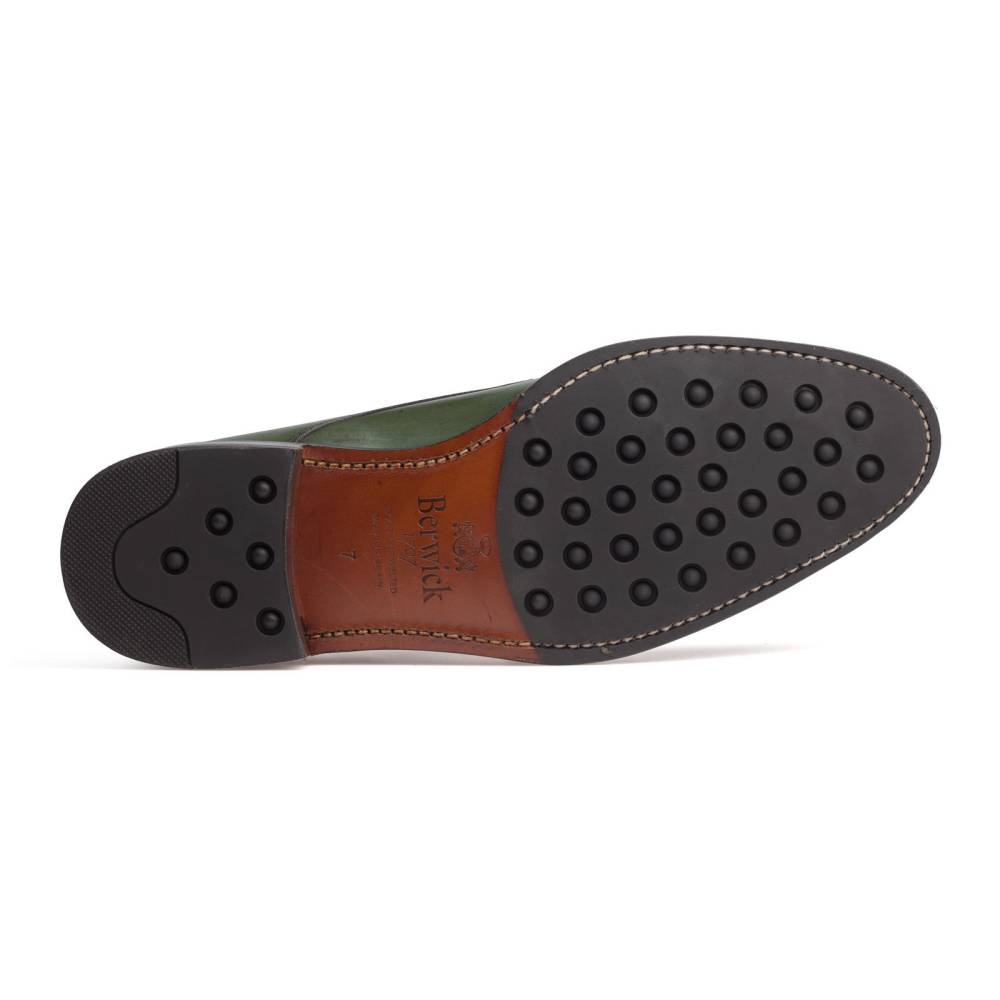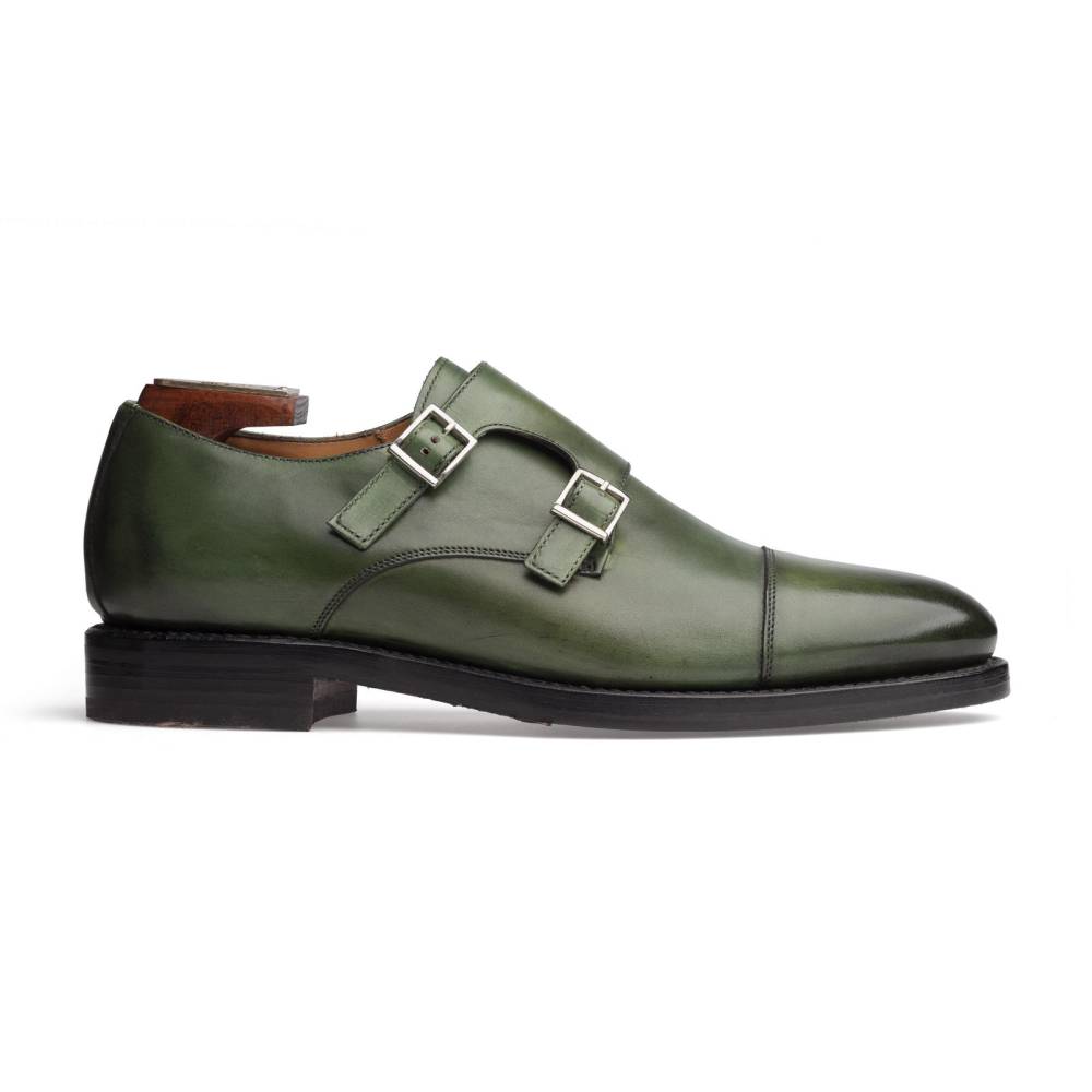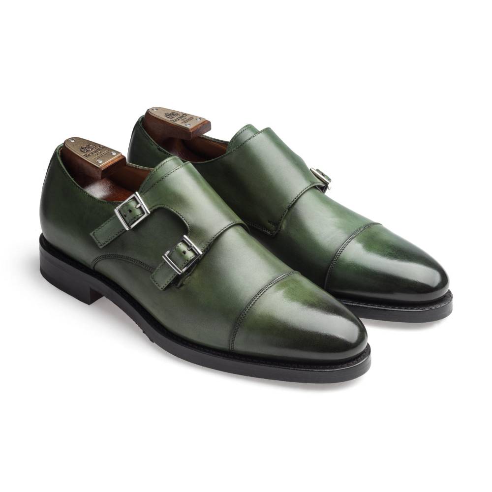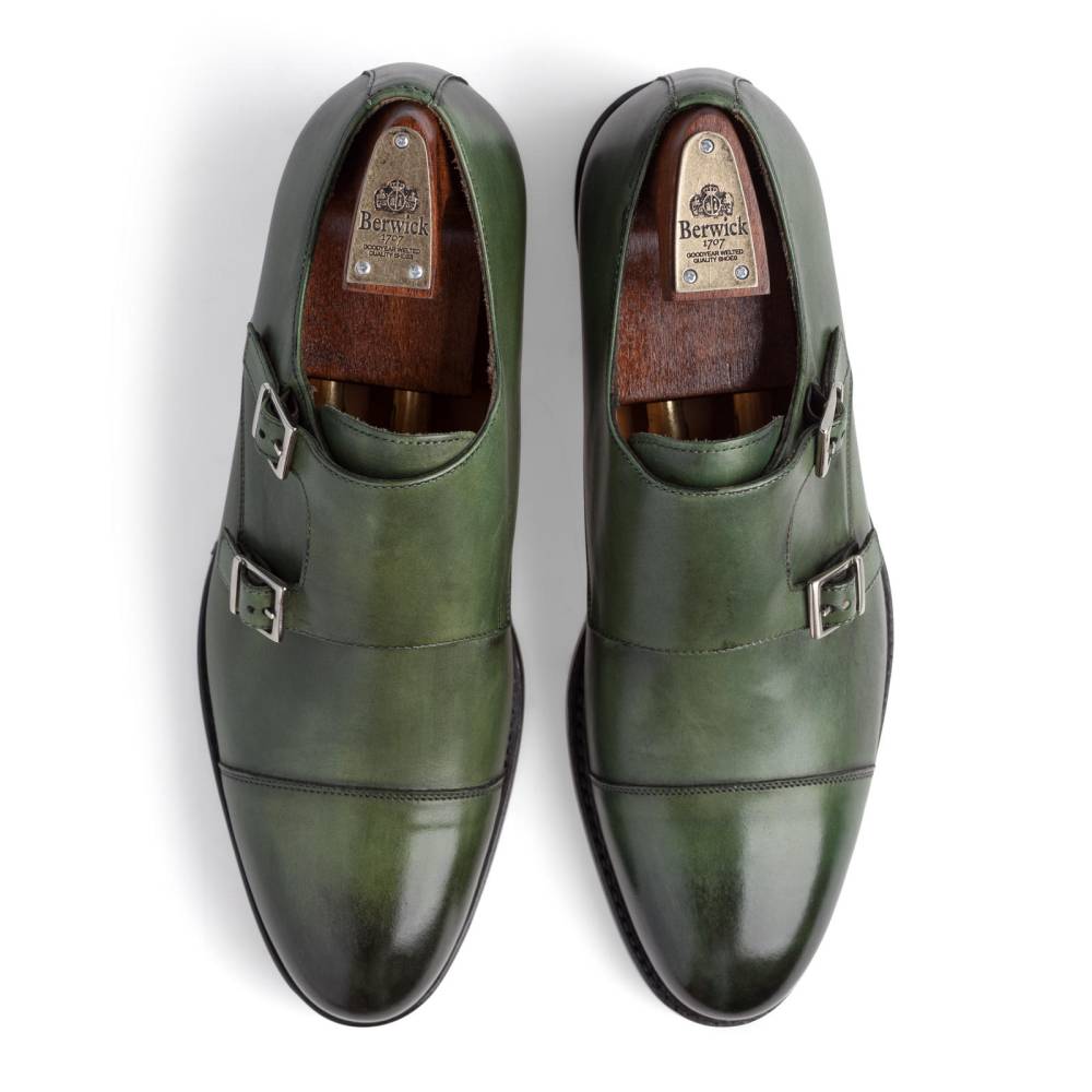 Эффектные туфли монки Berwick из телячьей кожи насыщенного зелёного цвета. Особенностью модели является техника ручной окраски, которая создает неповторимый внешний вид кожи с неравномерной игрой цвета и градиентным затемнением на мысе. Модель застёгивается на два ремешка с металлическими пряжками серебристого цвета. Подошва комбинированная, из кожи и резины. Конструкция Goodyear Welted.
