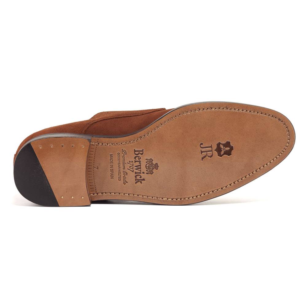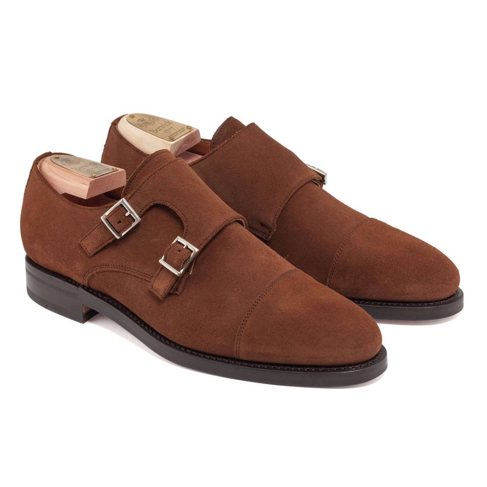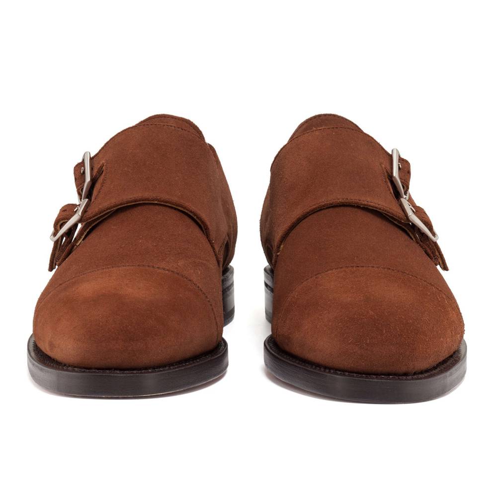 Коричневые туфли монки Berwick с двойными пряжками. Верх выполнен из высококачественной английской замши с бархатистым ворсом. На обувь установлена двухслойная кожаная подошва от знаменитой немецкой кожевенной мастерской Joh. Rendenbach. Внутренняя отделка из тонкой кожи горчичного оттенка. Конструкция Goodyear Welted.