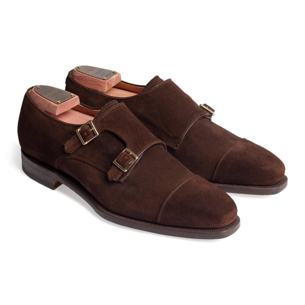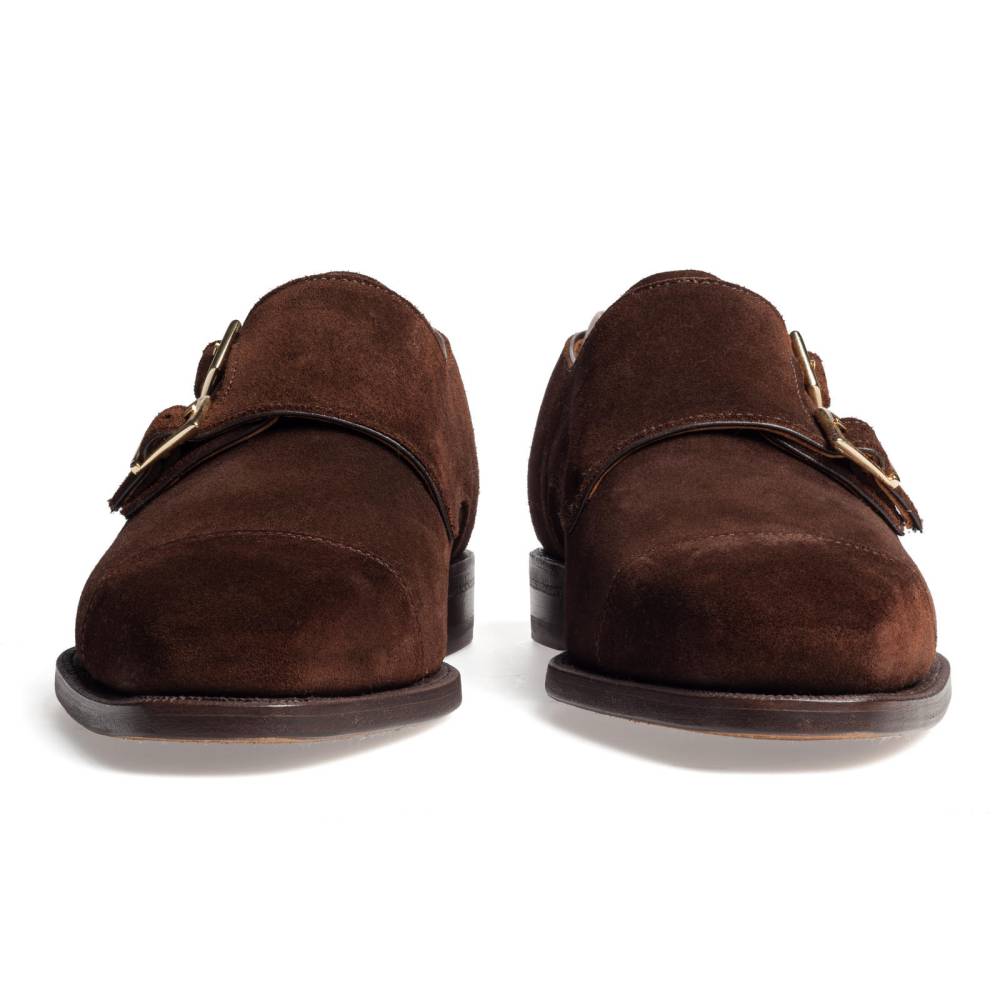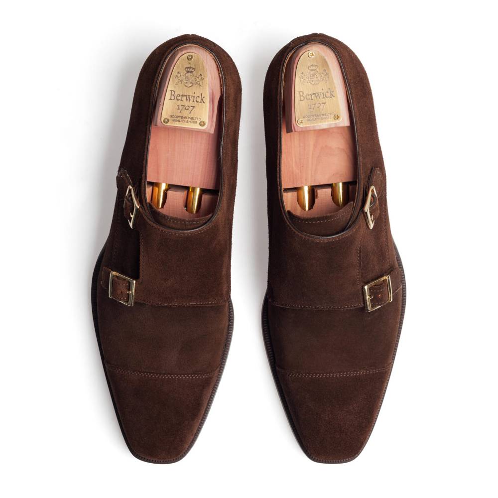 Коричневые монки Berwick с двойными пряжками. Верх выполнен из высококачественной промасленной замши с бархатистым ворсом. На обувь установлена двухслойная кожаная подошва от знаменитой немецкой кожевенной мастерской Joh. Rendenbach. Внутренняя отделка из тонкой кожи горчичного оттенка. Конструкция Goodyear Welted.