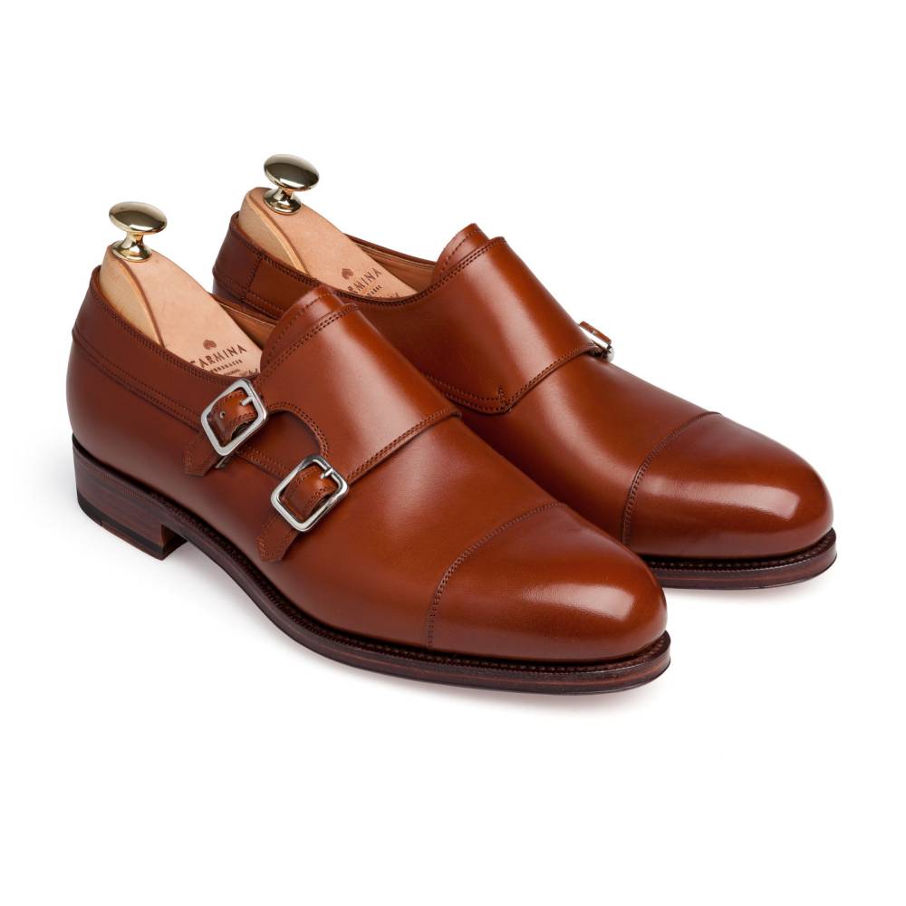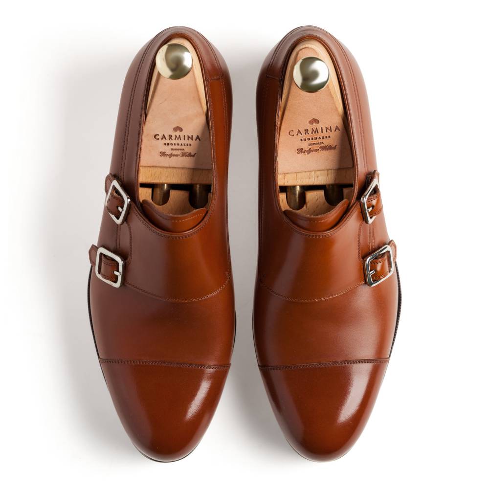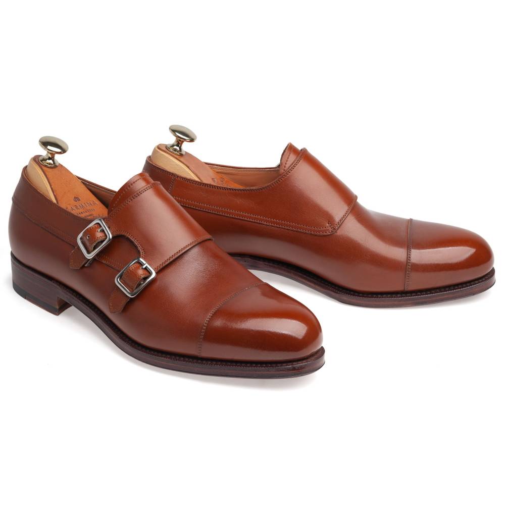 Оригинальные туфли-монки Carmina благородного коньячного цвета. Верх выполнен из высококачественной телячьей кожи. Отличительной особенностью данной модели являются два параллельных ремешка, дополненных пряжками из полированного металла. Кожаная подошва. Конструкция Goodyear Welted.