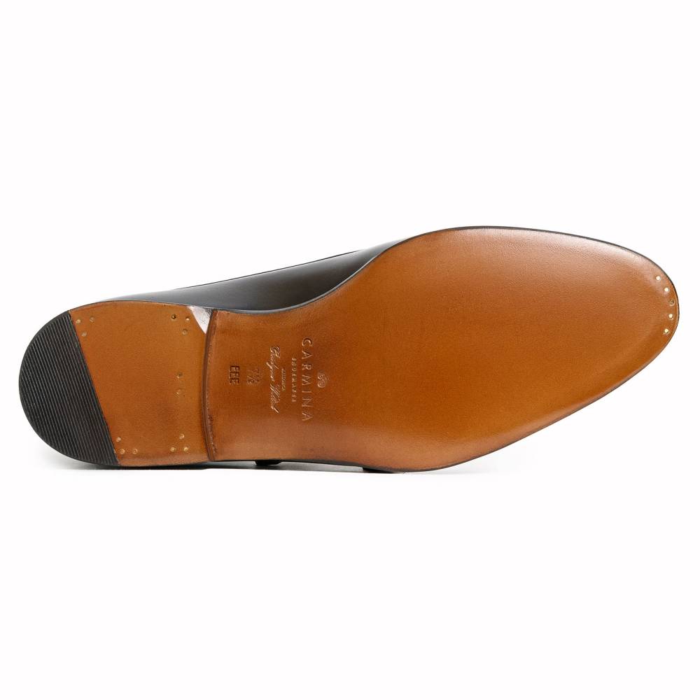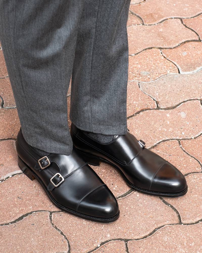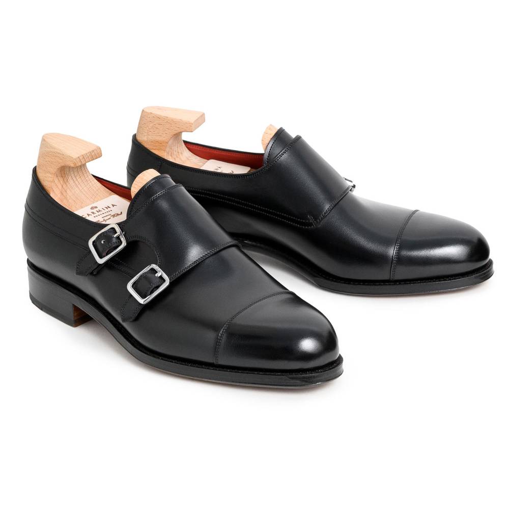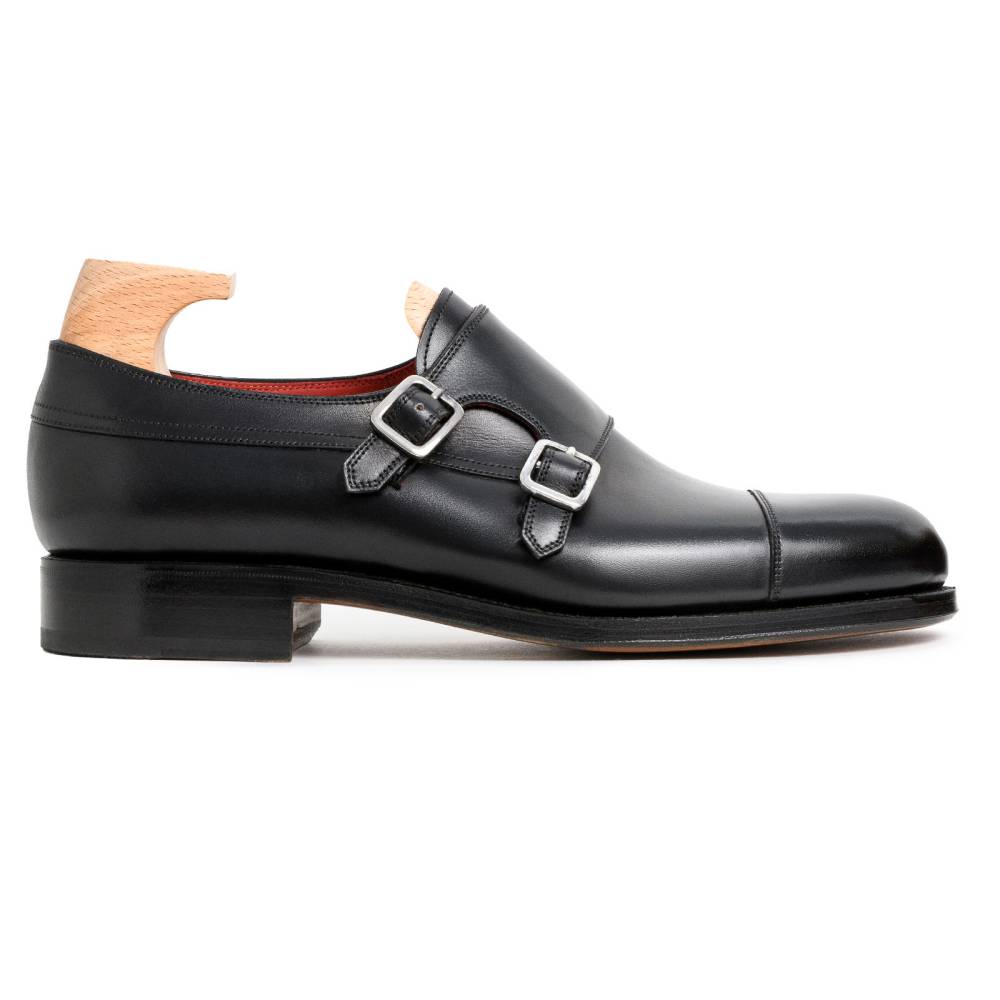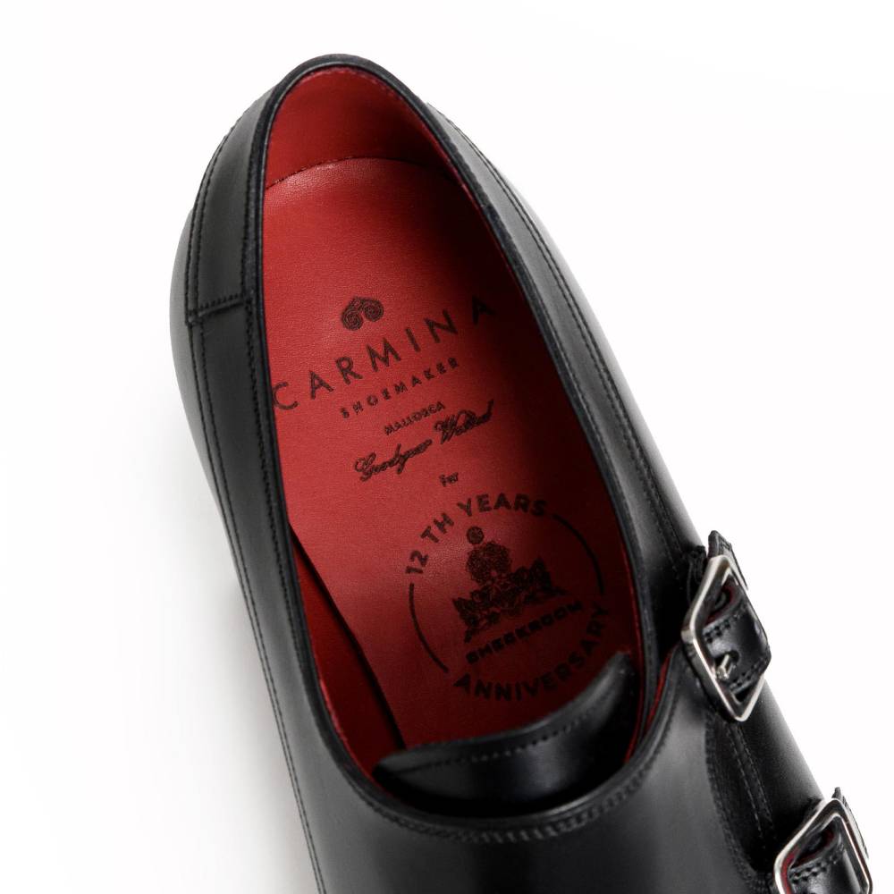 Чёрные монки Carmina с двумя пряжками. Верх выполнен из высококачественной телячьей кожи. По заказу бутика Checkroom подкладка сделана из тонкой красной телячьей кожи. Кожаная подошва. Конструкция Goodyear Welted. Эта модель была выпущена совместно с фабрикой Carmina к 12-й годовщине нашего бутика, о чём свидетельствует штамп на стельке.