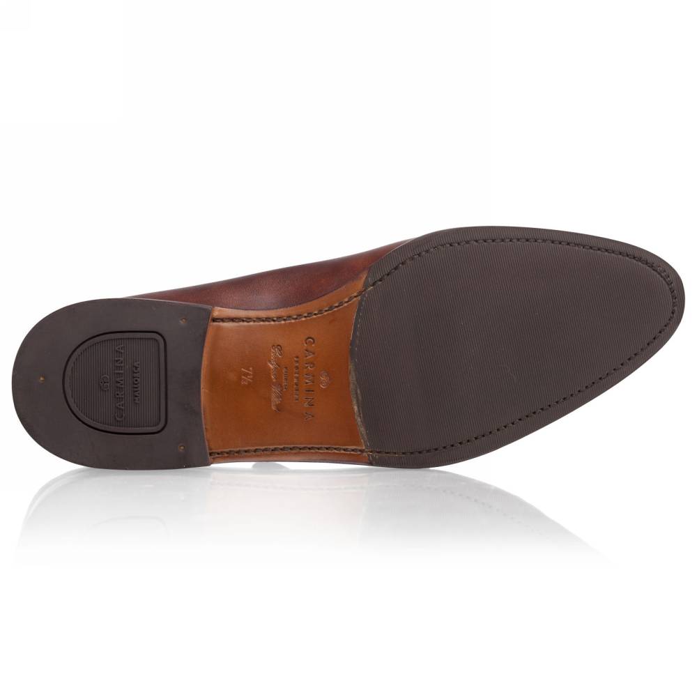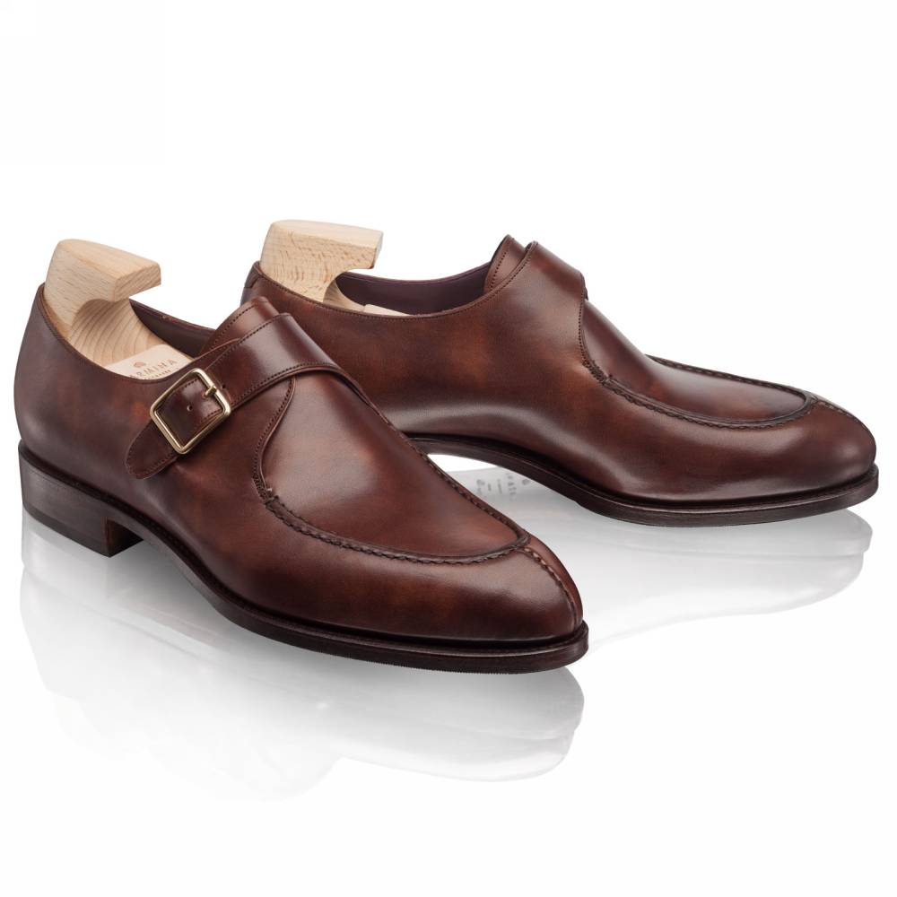 Повседневные монки Carmina Shoemaker на комбинированной подошве. Модель представляет собой монки с одной пряжкой в норвежском стиле с тремя сшитыми элементами в передней части (split toe single strap monk). Верх выполнен из высококачественной телячьей кожи «museum calf». Особенностью данного типа кожи является характерный «пятнистый окрас», который схож с узорами на мраморе. Конструкция Goodyear Welted.