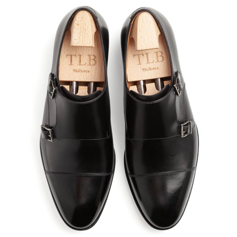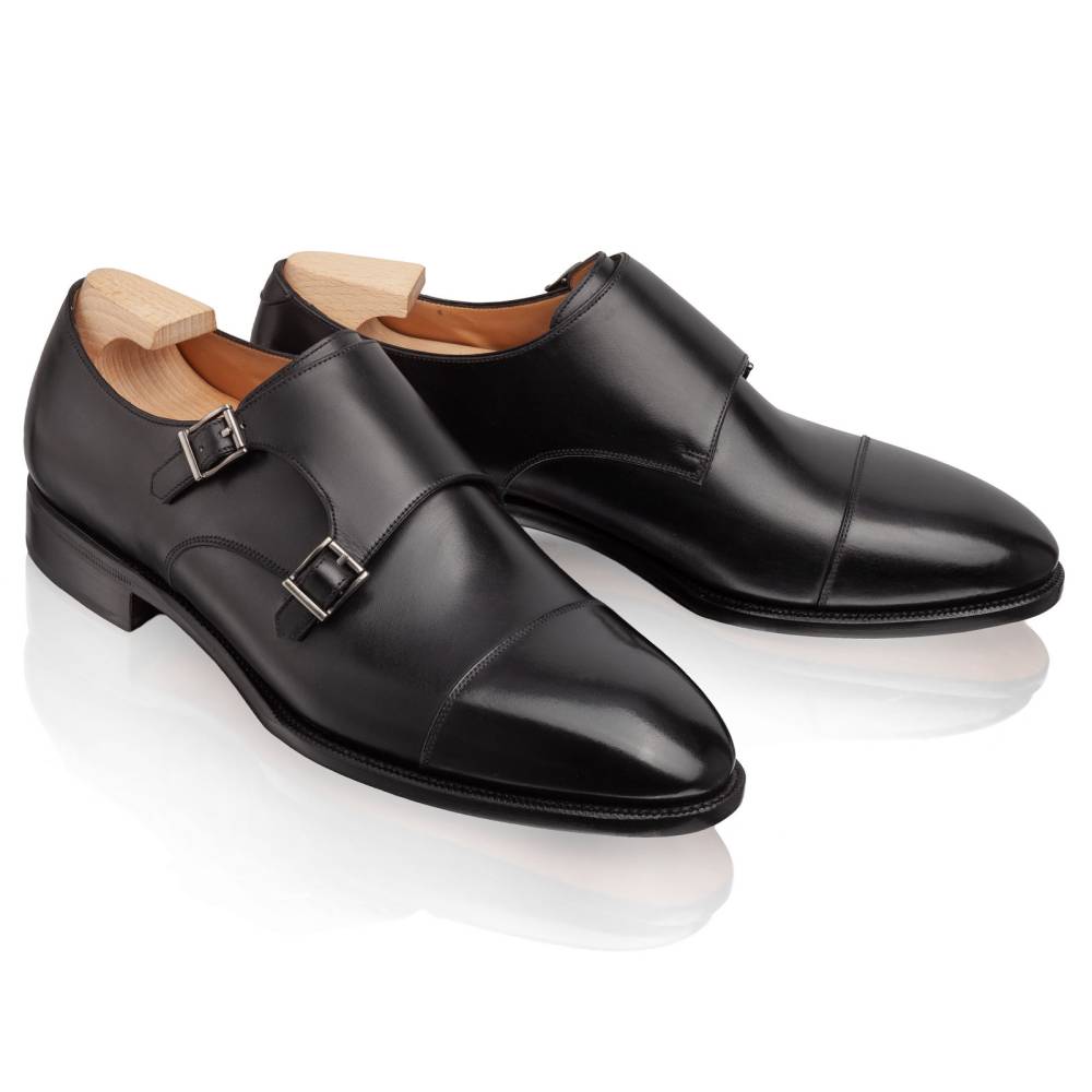 Монки с двумя пряжками (double monk) и отрезным мысом (cap toe) из премиальной линейки Artista. Универсальное воплощение делового стиля (business professional) и полуформальных образов. Верх выполнен из высококачественной телячьей кожи хромового дубления (box calf) чёрного цвета. Плотная фактура кожи отличается благородным блеском и превосходно держит форму. Внутренняя отделка из тонкой кожи растительного дубления обеспечивает идеальную посадку. Кожаная подошва, с закрытым швом, делает пару более утончённой и целостной. Конструкция Goodyear Welted.