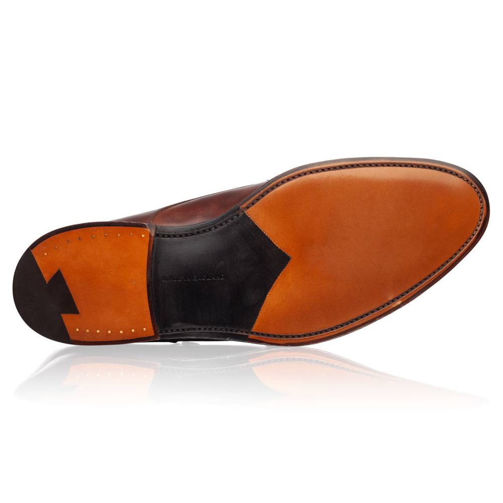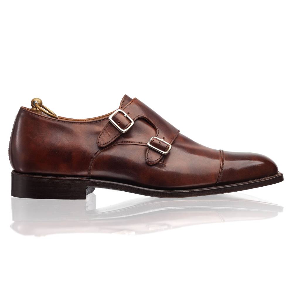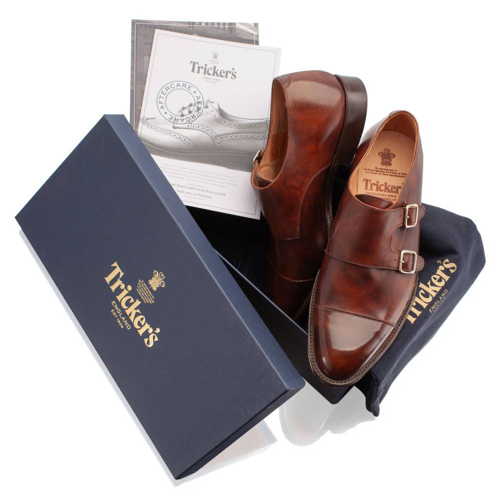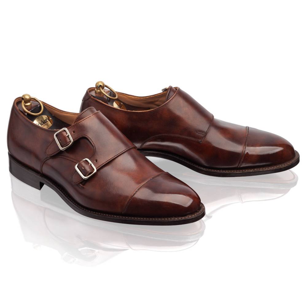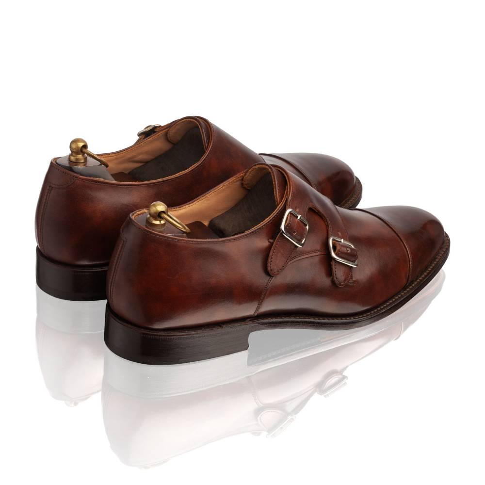Мужские классические монки Leavenworth от английской обувной фабрики Tricker’s. Модель создана по специальному заказу магазина Checkroom (MTO). Верх обуви выполнен из гладкой телячьей кожи «museum calf». Особенностью данного типа кожи является характерный пятнистый окрас, который схож с узорами на мраморе. Внутренняя отделка из тонкой мягкой кожи горчичного оттенка. Туфли представляют собой традиционный тип обуви double monk – монки, которые застёгиваются на два ремешка. Кожаная подошва. Конструкция Goodyear Welted.