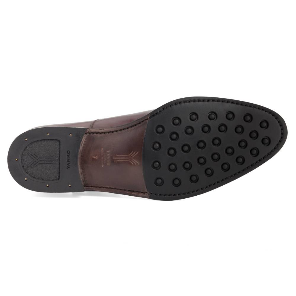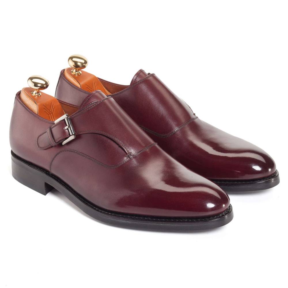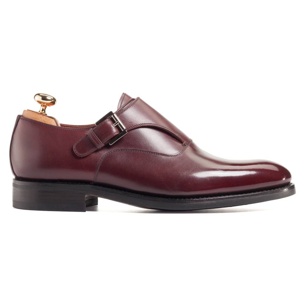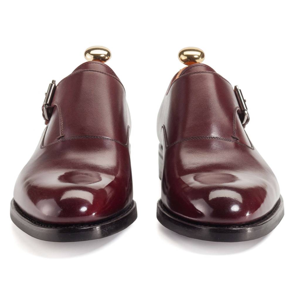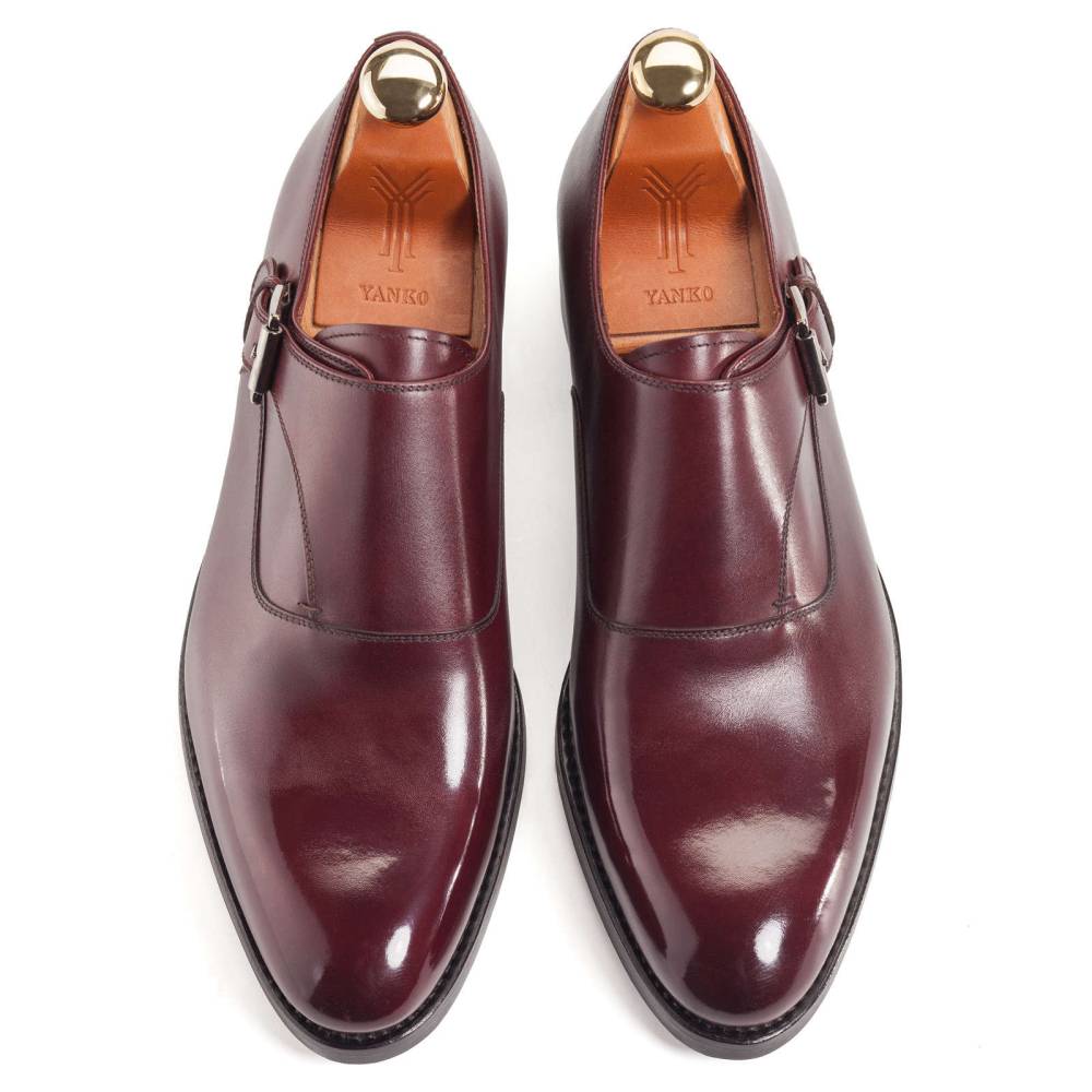 Элегантные туфли монки Yanko выполнены из гладкой телячьей кожи бордового цвета. Модель имеет универсальную износостойкую подошву из прочной резины и кожи. Туфли застёгиваются на один ремешок с квадратной пряжкой из полированного металла тёмно-серого цвета. Внутренняя отделка из тонкой бежевой кожи. Область пятки с внутренней стороны выполнена из замши. Конструкция Goodyear.