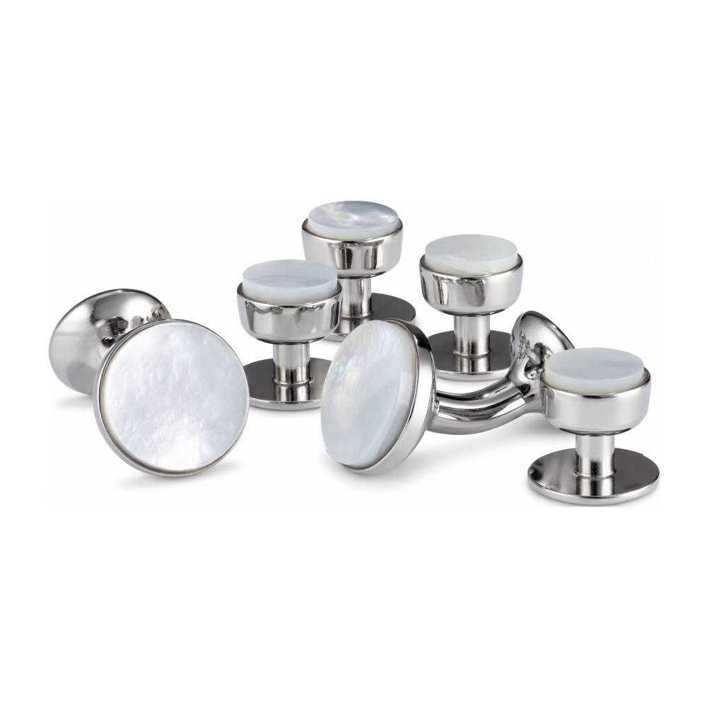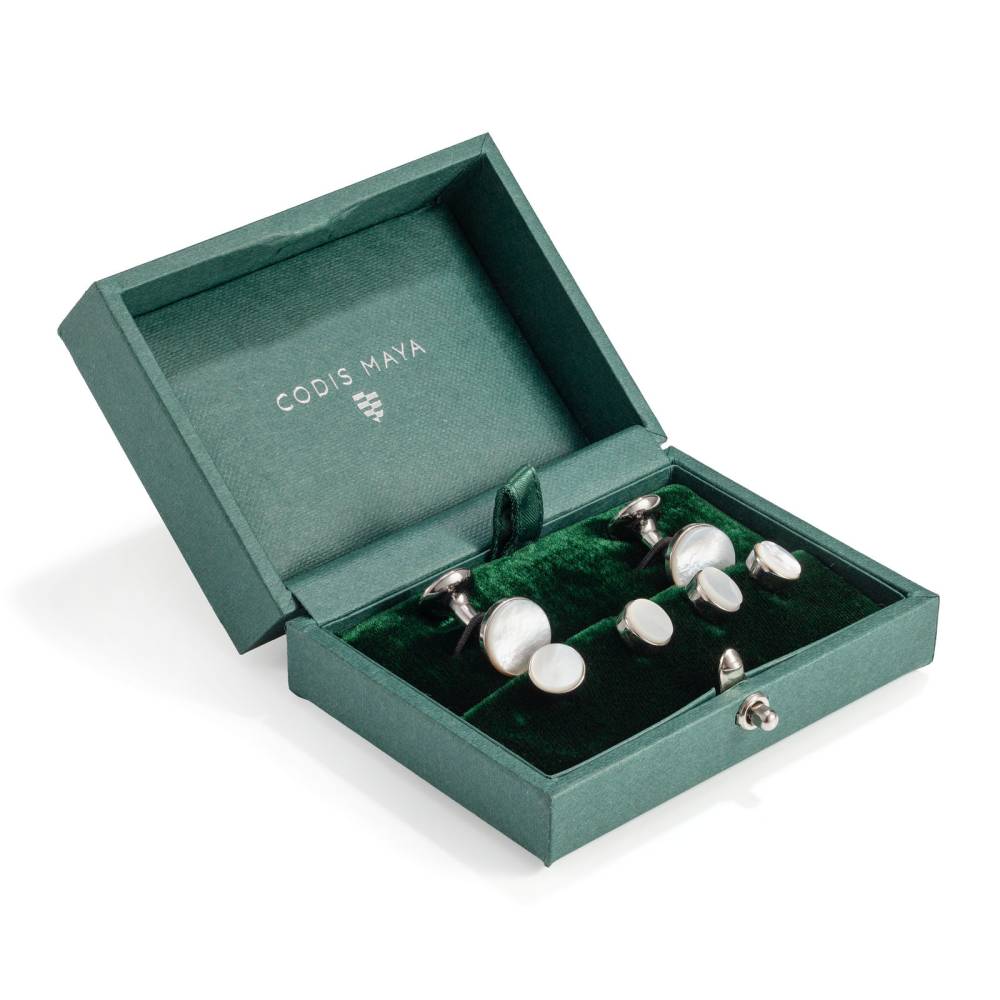 Эксклюзивный вечерний набор от британской мануфактуры Codis Maya. Результат кропотливого ручного труда и воплощение лучших традиций английского ремесленного мастерства. Комплект из запонок и четырех пуговиц для сорочки изготовлен вручную из цельной латуни, выточен на токарном станке и отполирован мастерами до зеркального блеска. Основание покрыто износостойким родием, чей благородный холодный блеск идеально подчеркивает вставки из натурального серого перламутра. Мягкие глубокие переливы природного материала служат утонченной и аристократичной альтернативой классическому ониксу, безупречно дополняя торжественный образ в стиле Black Tie. Поставляются в фирменном темно-зеленом футляре.