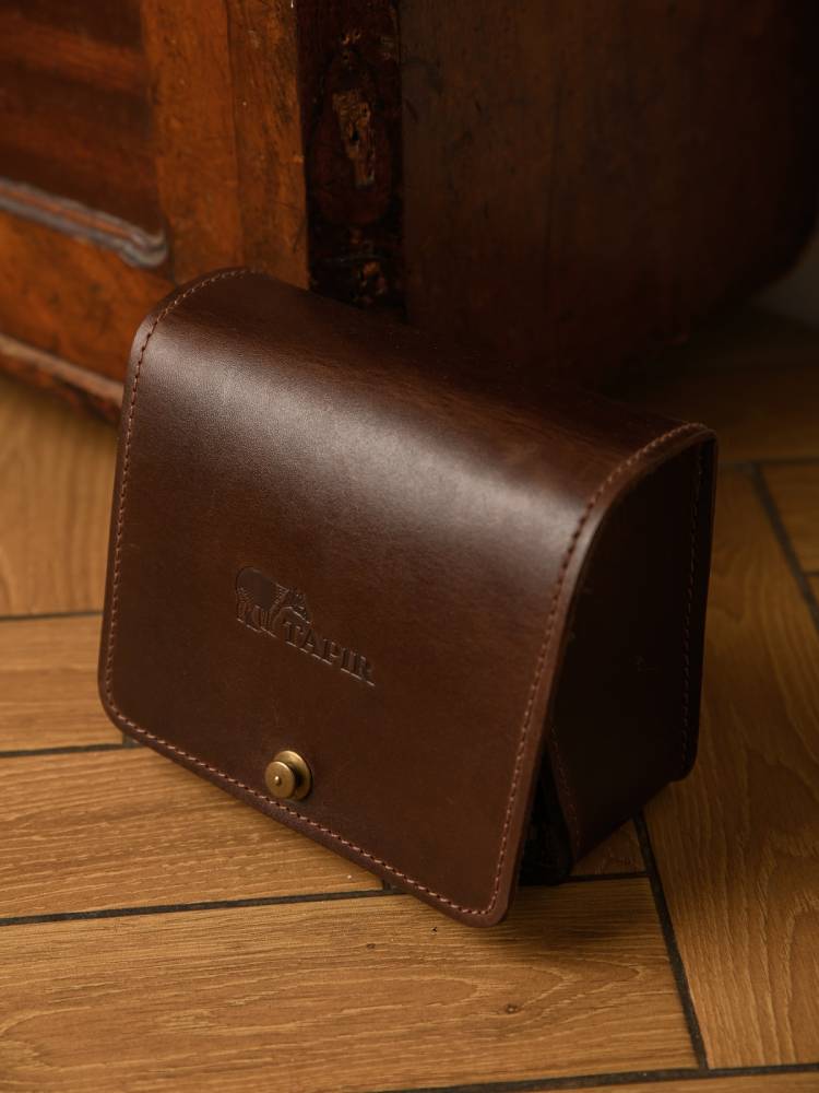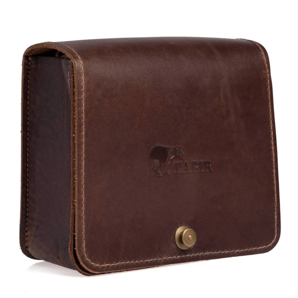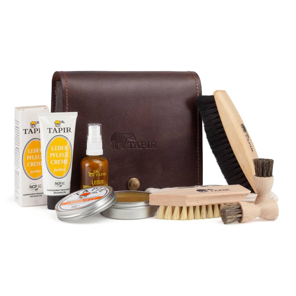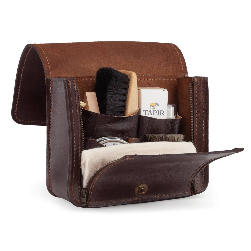 Набор для ухода за обувью немецкого бренда Tapir. Это идеальный спутник в путешествиях и командировках, когда под рукой должны быть все необходимые средства для поддержания безупречного вида обуви. Набор помещен в сумку-пенал, выполненную из натуральной кожи темно-коричневого цвета в винтажном стиле. Сумка изготовлена вручную из кожи растительного дубления, которая со временем приобретает благородную патину. По бокам расположены две молнии для легкого доступа ко всем средствам, а клапан надежно закрывается с помощью высококачественной кнопки Tedox.