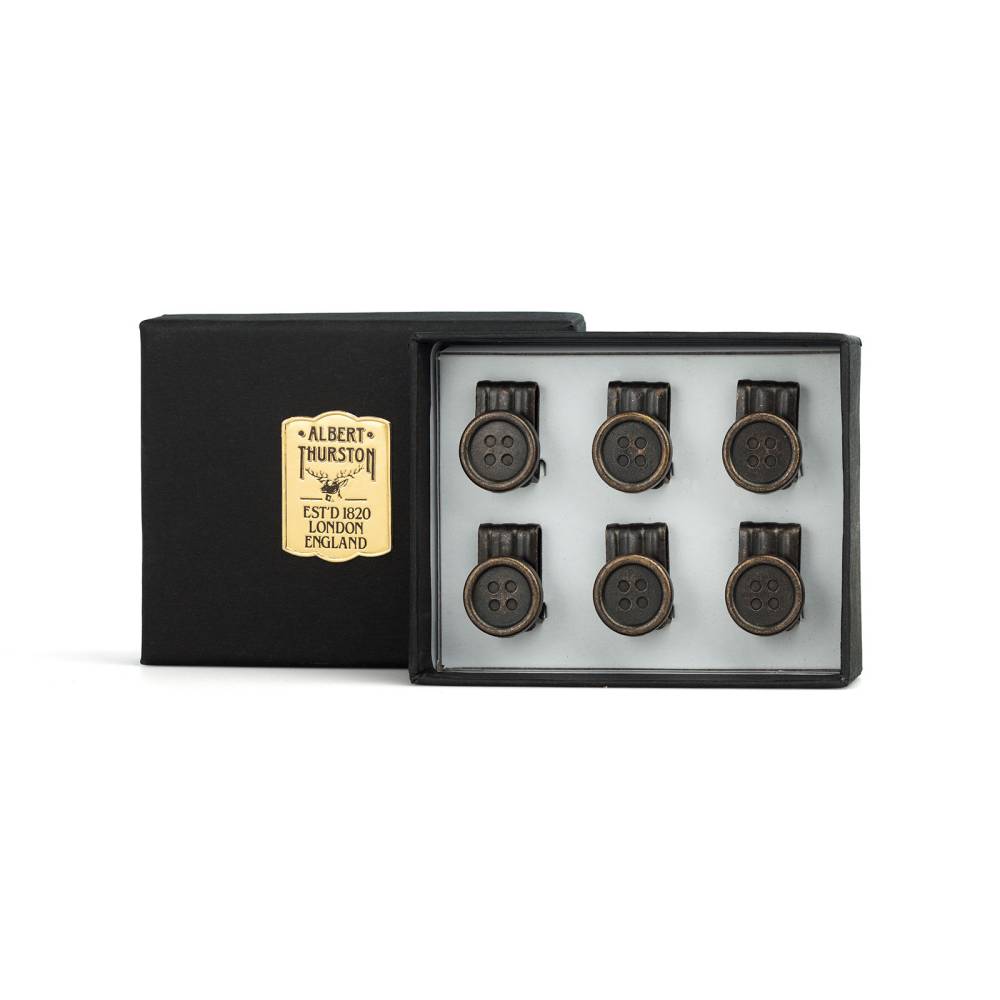 Набор из шести пуговиц для крепления подтяжек английского бренда Albert Thurston. Металлические пуговицы цвета состаренной латуни крепятся к брюкам специальными зажимами: одного набора будет достаточно для нескольких пар брюк, а продуманная конструкция зажимов позволяет быстро и легко снимать и надёжно закреплять пуговицы на брючном поясе.