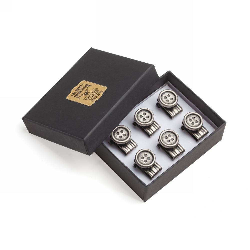 Набор из шести пуговиц для крепления подтяжек английского бренда Albert Thurston. Металлические пуговицы серебристого цвета крепятся к брюкам специальными зажимами: одного набора будет достаточно для нескольких пар брюк, а продуманная конструкция зажимов позволяет быстро и легко снимать и надёжно закреплять пуговицы на брючном поясе.