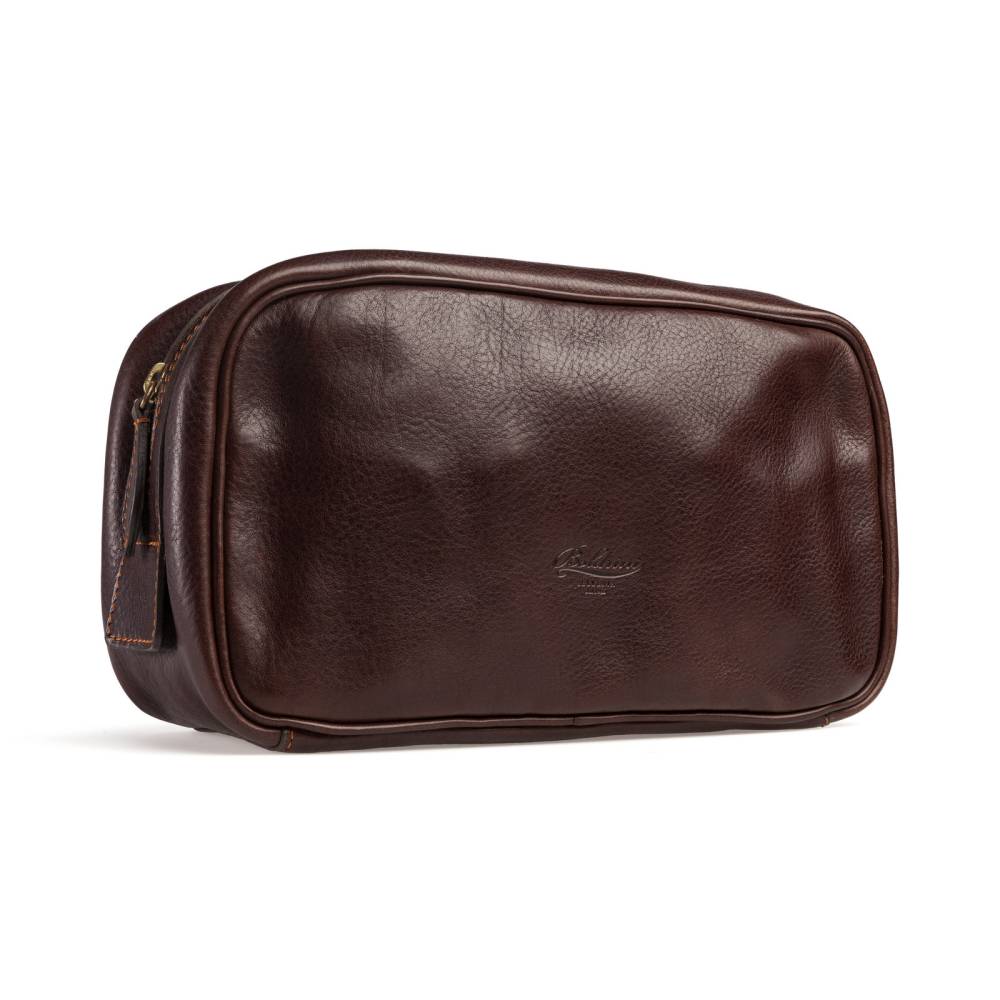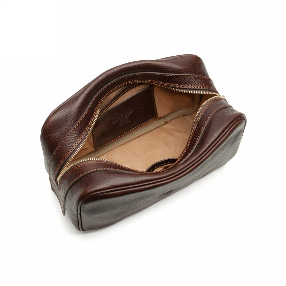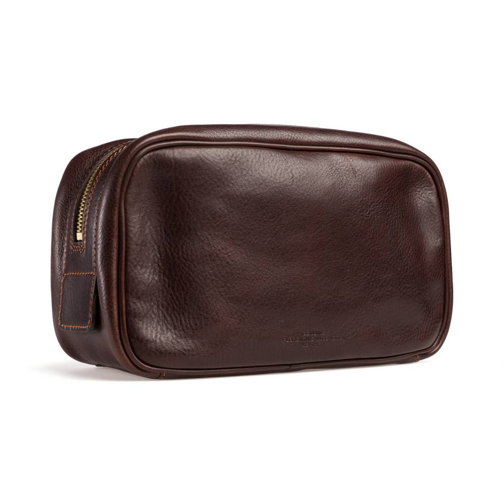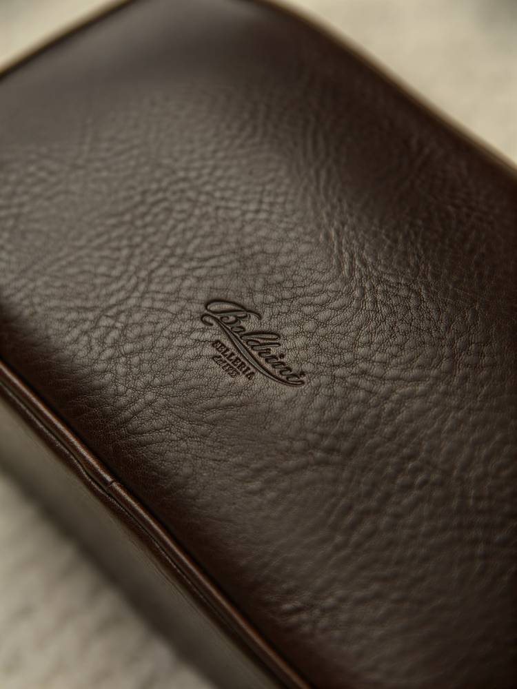 Удобный и практичный несессер итальянской мануфактуры Boldrini Selleria. Выполнен из фактурной телячьей кожи растительного дубления тёмно-коричневого цвета. Легко вмещает бритвенные принадлежности, парфюм и другие необходимые в поездке предметы. Внутри подкладка из приятной на ощупь бархатистой бежевой алькантары. Закрывается на надёжную латунную молнию. Идеальный выбор для путешествий или подарка, сочетающий тосканские традиции и современную функциональность.