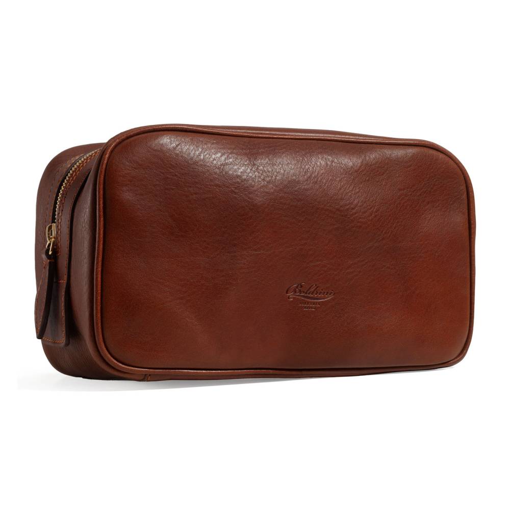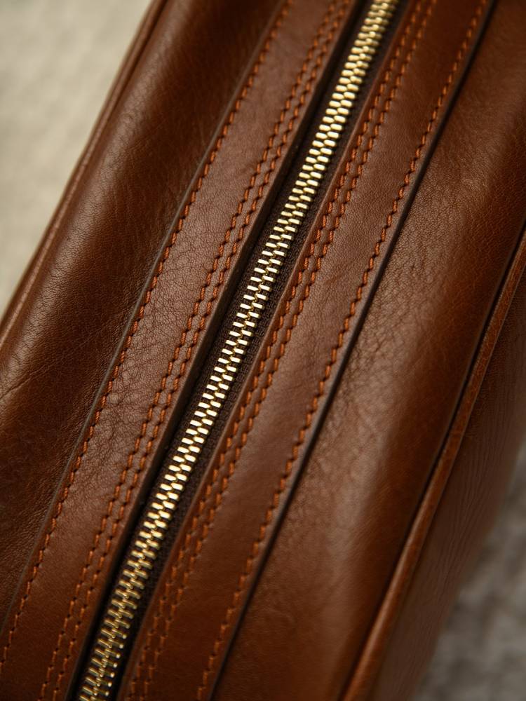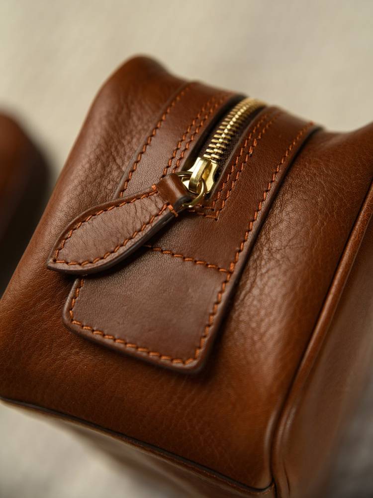 Удобный и практичный несессер итальянской мануфактуры Boldrini Selleria. Выполнен из фактурной телячьей кожи растительного дубления коричневого цвета. Легко вмещает бритвенные принадлежности, парфюм и другие необходимые в поездке предметы. Внутри подкладка из приятной на ощупь бархатистой бежевой алькантары. Закрывается на надёжную латунную молнию. Идеальный выбор для путешествий или подарка, сочетающий тосканские традиции и современную функциональность.