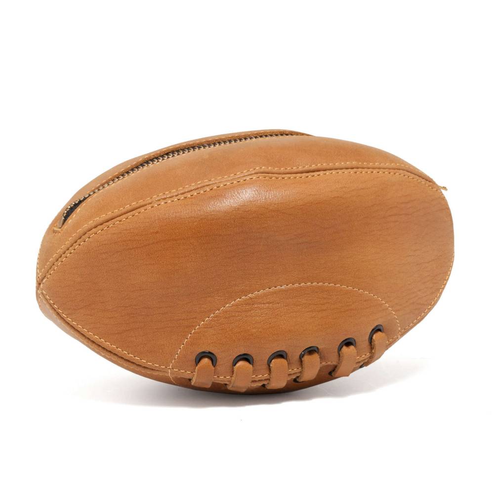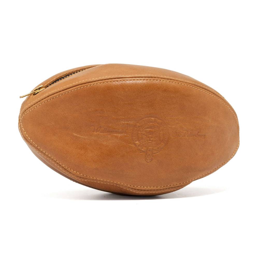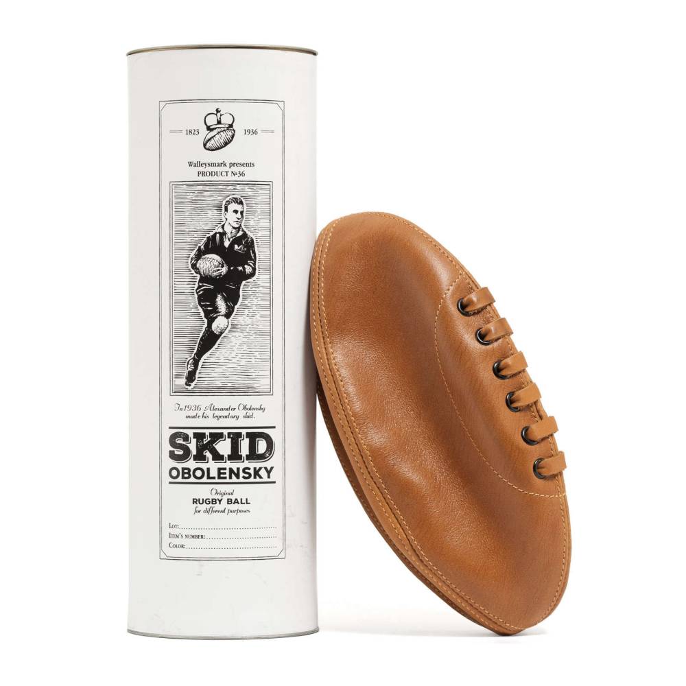 Практичный несессер из телячьей кожи светло-коричневого цвета выполнен в виде мяча для регби. При желании его действительно можно использовать в качестве спортивного снаряда. Оригинальный аксессуар посвящён Александру Оболенскому, легендарному регбисту российского происхождения, выступавшему за национальную сборную Англии. Подкладка выполнены из хлопковой ткани. В несессер вмещается все самое необходимое: бритвенные принадлежности, зубная щётка, мыло и туалетная вода. Несессер вложен в картонную коробку, где также присутвтет историческая справка и описание товара.