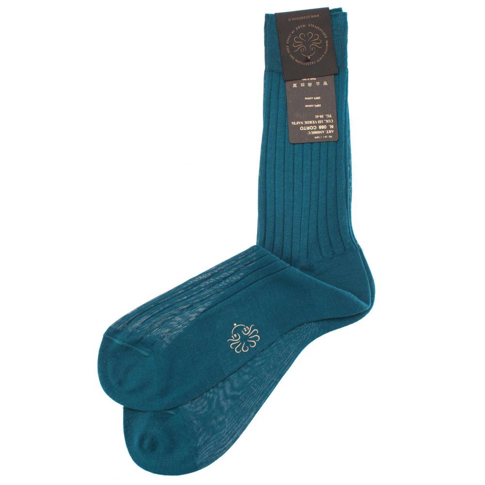 Тонкие классические мужские носки Alto Milano насыщенного тёмно-зелёного цвета полностью выполнены из приятной на ощупь ткани, а именно из фильдекоса (fil d’ecosse / cotton lisle). Фильдекос – это туго скрученная хлопчатобумажная нить, созданная из лучших сортов хлопчатника. Носки из такого материала отличаются высокой прочностью и износостойкостью: они прекрасно держат форму и не портятся после стирок. Шов на мысе выполнен вручную, а не на машинке, поэтому он мягкий и гладкий.