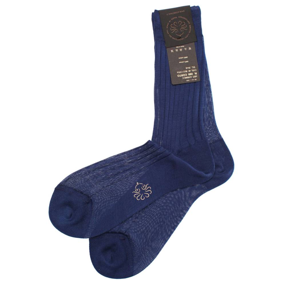 Тонкие классические мужские носки Alto Milano тёмно-синего цвета полностью выполнены из приятной на ощупь ткани, а именно из фильдекоса (fil d’ecosse / cotton lisle). Фильдекос – это туго скрученная хлопчатобумажная нить, созданная из лучших сортов хлопчатника. Носки из такого материала отличаются высокой прочностью и износостойкостью: они прекрасно держат форму и не портятся после стирок. Шов на мысе выполнен вручную, а не на машинке, поэтому он мягкий и гладкий.
