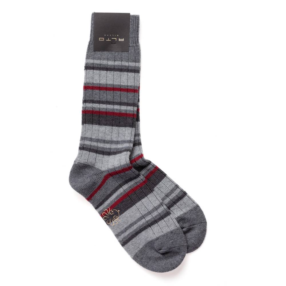 Тёплые объёмные носки из осенне-зимней коллекции итальянского бренда Alto Milano. Модель с традиционной ребристой фактурой и контрастными полосами отлично подойдёт для повседневной зимней обуви и дополнит casual гардероб в прохладное время года. Носки связаны из толстой мериносовой пряжи с добавлением полиамида и эластана для большей прочности и комфорта.