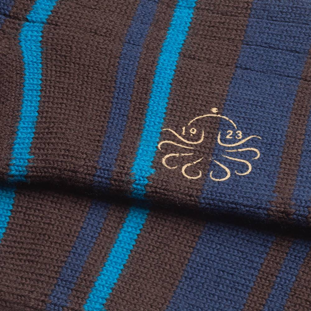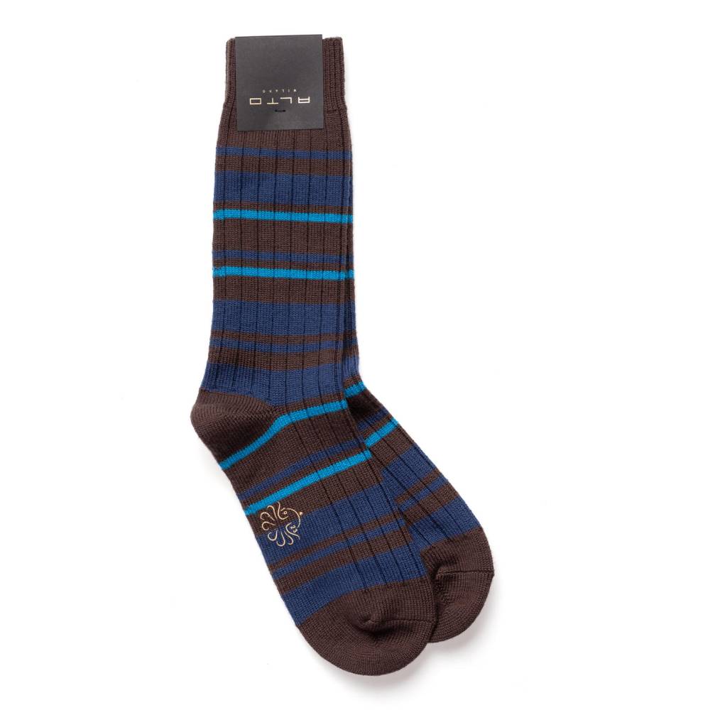 Тёплые объёмные носки из осенне-зимней коллекции итальянского бренда Alto Milano. Модель с традиционной ребристой фактурой и контрастными полосами отлично подойдёт для повседневной зимней обуви и дополнит casual гардероб в прохладное время года. Носки связаны из толстой мериносовой пряжи с добавлением полиамида и эластана для большей прочности и комфорта.
