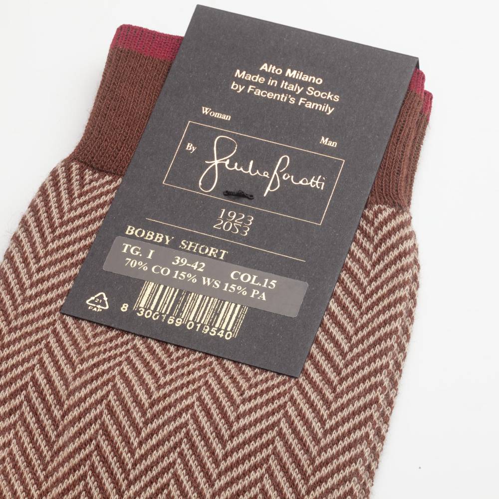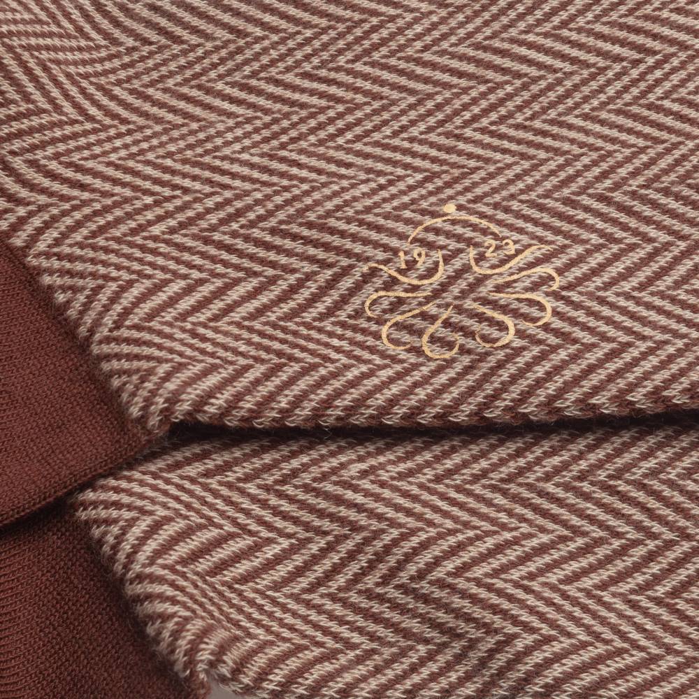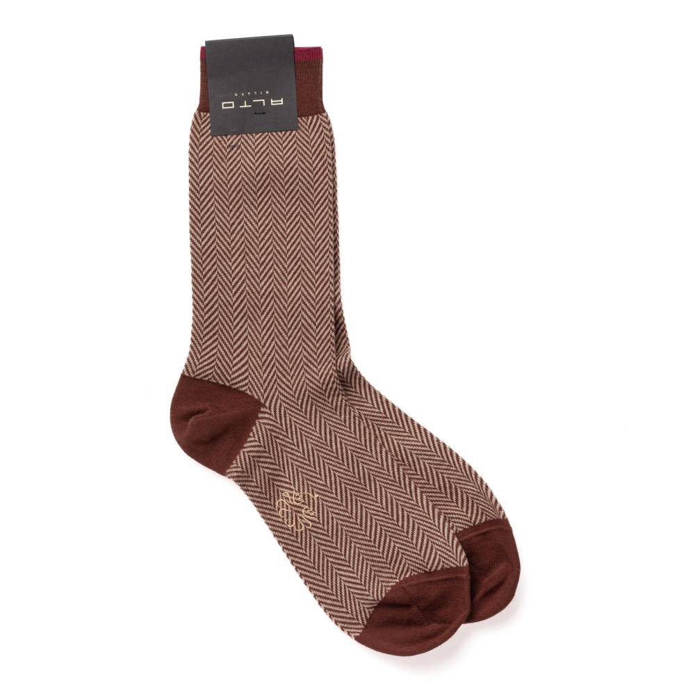 Тёплые носки средней плотности из осенне-зимней коллекции итальянского бренда Alto Milano. Классический узор ёлочка будет уместен для нестрогих образов в прохладное время года. Модель связана из хлопковой пряжи с добавлением нейлона, который обеспечивает большую прочность и кашемира. Последний добавляет изделию мягкость и сохраняет тепло.