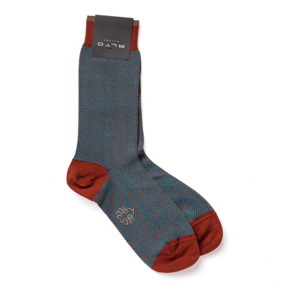Тёплые носки средней плотности из осенне-зимней коллекции итальянского бренда Alto Milano. Классический узор ёлочка будет уместен для нестрогих образов в прохладное время года. Модель связана из хлопковой пряжи с добавлением нейлона, который обеспечивает большую прочность и кашемира. Последний добавляет изделию мягкость и сохраняет тепло.
