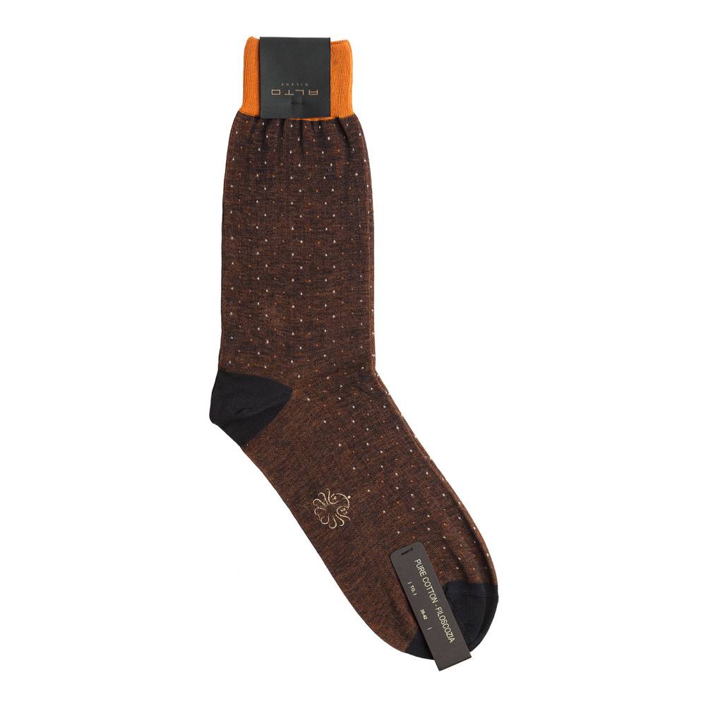 Элегантные носки Alto Milano коричневого цвета со сдержанным узором в мелкий горошек подойдут для повседневного классического гардероба. Модель выполнена из приятной на ощупь хлопковой ткани с добавлением полиамида. Носки отличаются высокой прочностью и износостойкостью: они прекрасно сохраняют форму и выдерживают множество стирок.