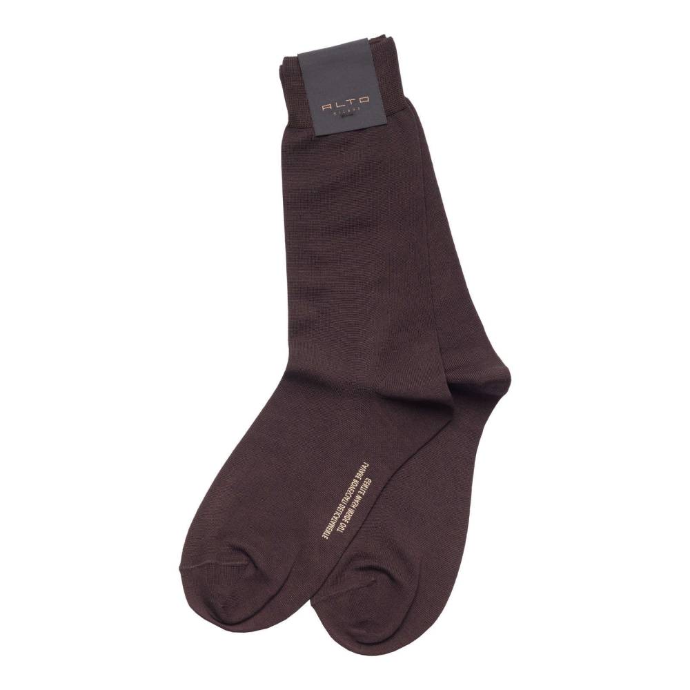 Гладкие повседневные носки Alto Milano сдержанного тёмно-коричневого цвета. Модель выполнена из приятной на ощупь хлопковой ткани с добавлением полиамида. Носки отличаются высокой прочностью и износостойкостью: они прекрасно сохраняют форму и выдерживают множество стирок.