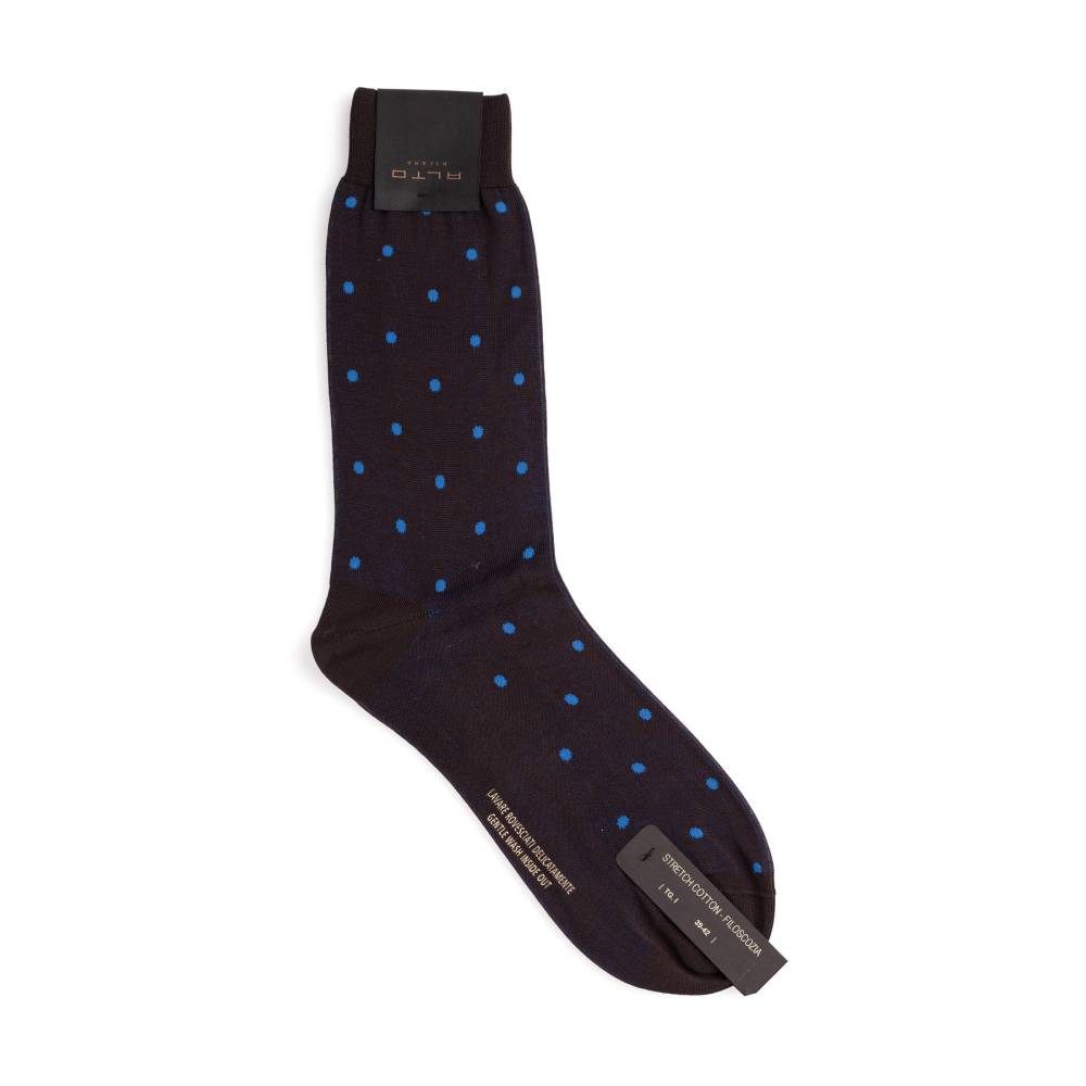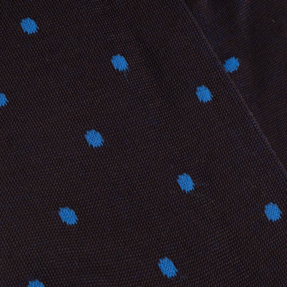 Элегантные и сдержанные носки Alto Milano тёмно-коричневого цвета в синий горошек подойдут для повседневного классического гардероба. Модель выполнена из приятной на ощупь хлопковой ткани с добавлением полиамида. Носки отличаются высокой прочностью и износостойкостью: они прекрасно сохраняют форму и выдерживают множество стирок.
