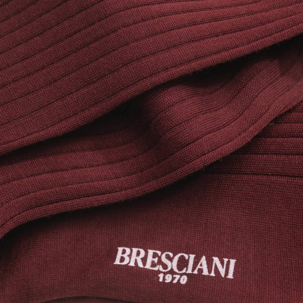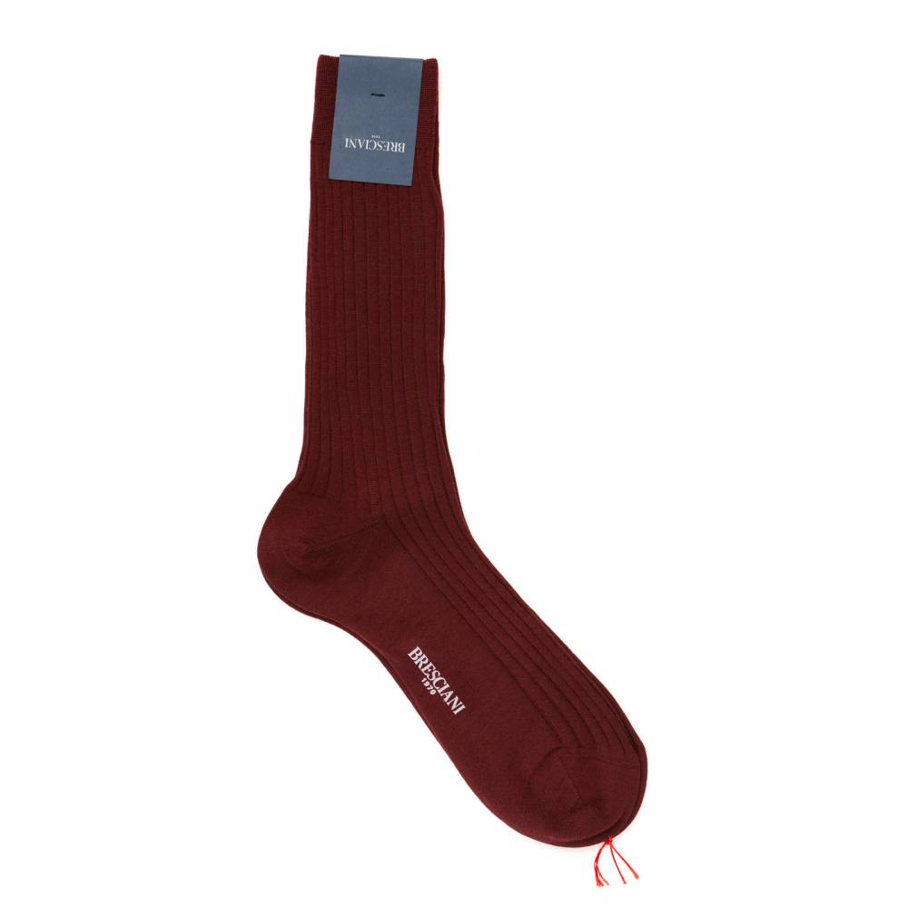 Бордовые шерстяные мужские носки премиум-класса итальянской марки Bresciani. Пряжа сделана из шерсти австралийских овец-мериносов двойного кручения с добавлением полиамида для долговечности. Носки изготавливают на итальянской фабрике Bresciani на станках с 200 иглами и более и применением ручного труда. Мысок присоединён к основной части носка кеттельным швом, выполненным на специальной машинке: такой шов практически незаметен и не доставляет дискомфорта.