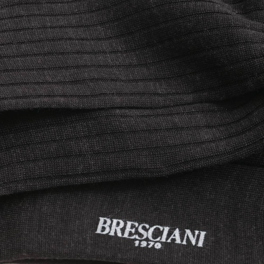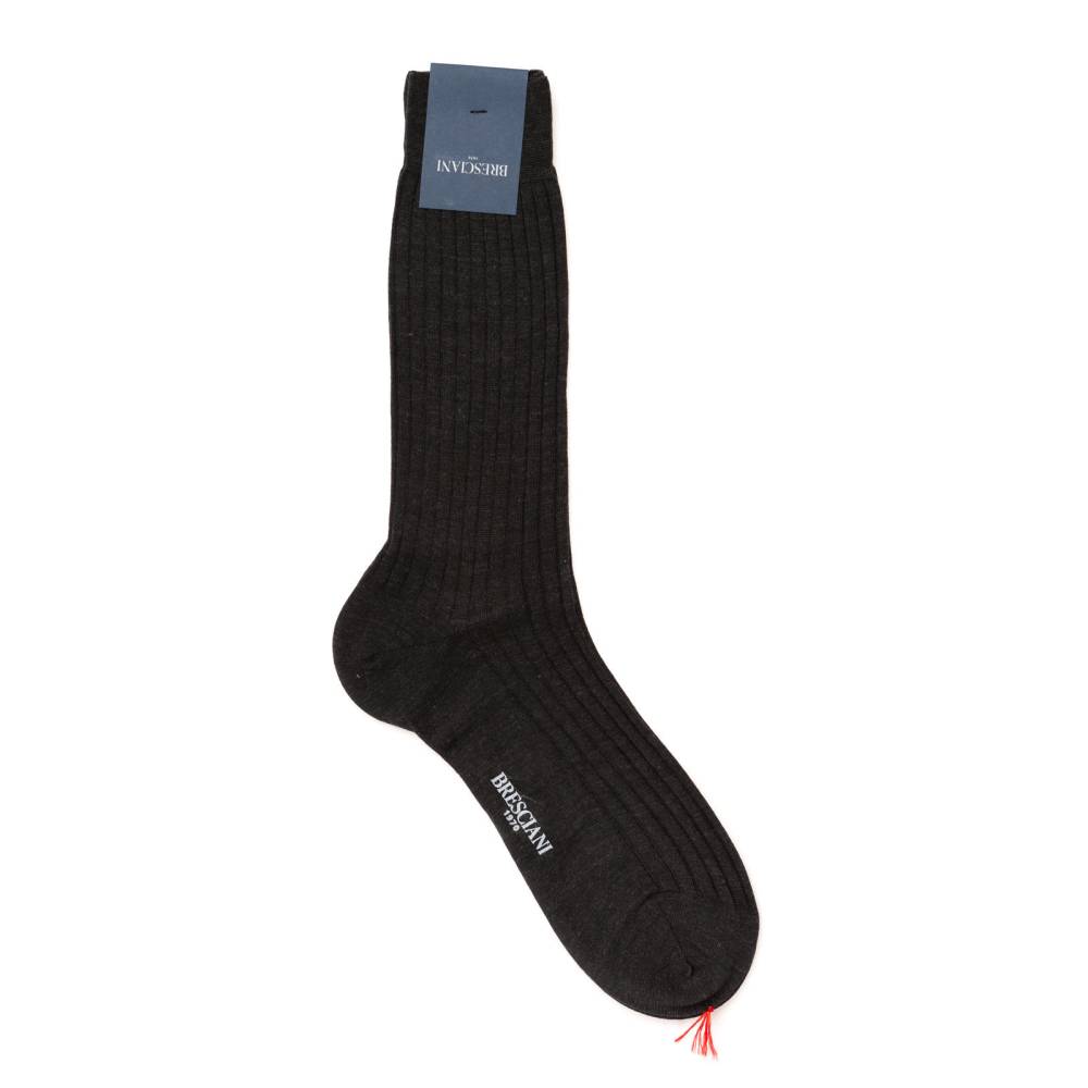 Тёмно-серые шерстяные мужские носки премиум-класса итальянской марки Bresciani. Пряжа сделана из шерсти австралийских овец-мериносов двойного кручения с добавлением полиамида для долговечности. Носки изготавливают на итальянской фабрике Bresciani на станках с 200 иглами и более и применением ручного труда. Мысок присоединён к основной части носка кеттельным швом, выполненным на специальной машинке: такой шов практически незаметен и не доставляет дискомфорта.
