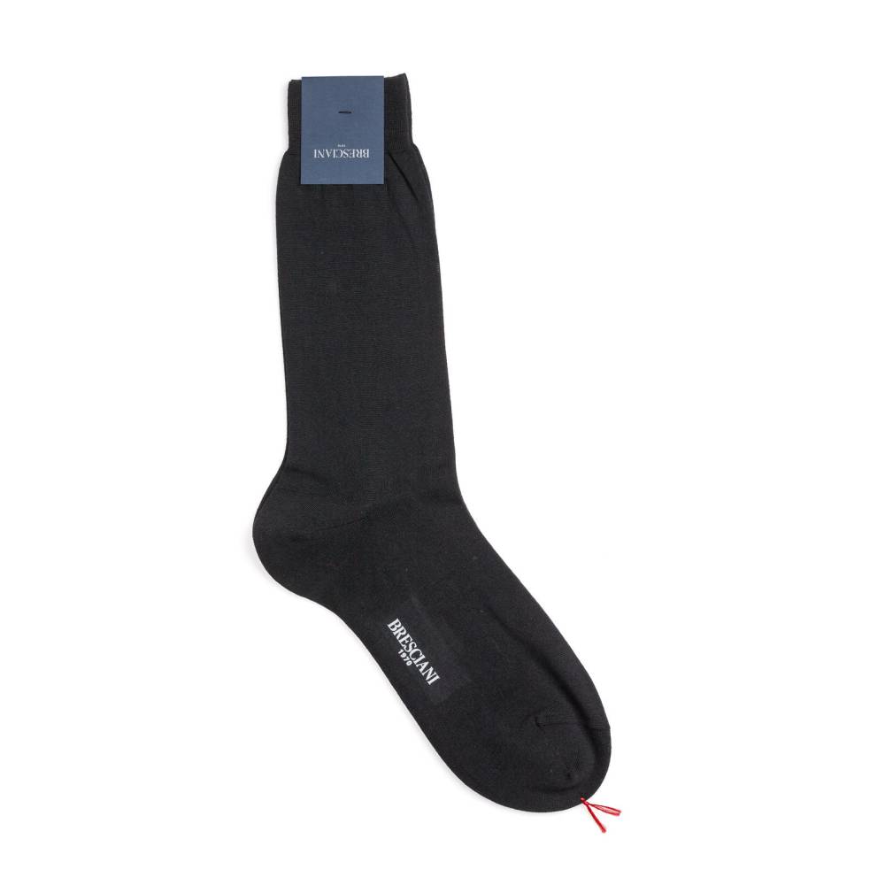 Гладкие классические мужские носки премиум-класса итальянской марки Bresciani чёрного цвета. Пряжа сделана из шерсти австралийских овец-мериносов двойного кручения с добавлением нейлона для долговечности. Носки изготавливают на итальянской фабрике Bresciani на станках с 200 иглами и более и применением ручного труда. Мысок присоединён к основной части носка кеттельным швом, выполненным на специальной машинке: такой шов практически незаметен и не доставляет дискомфорта.