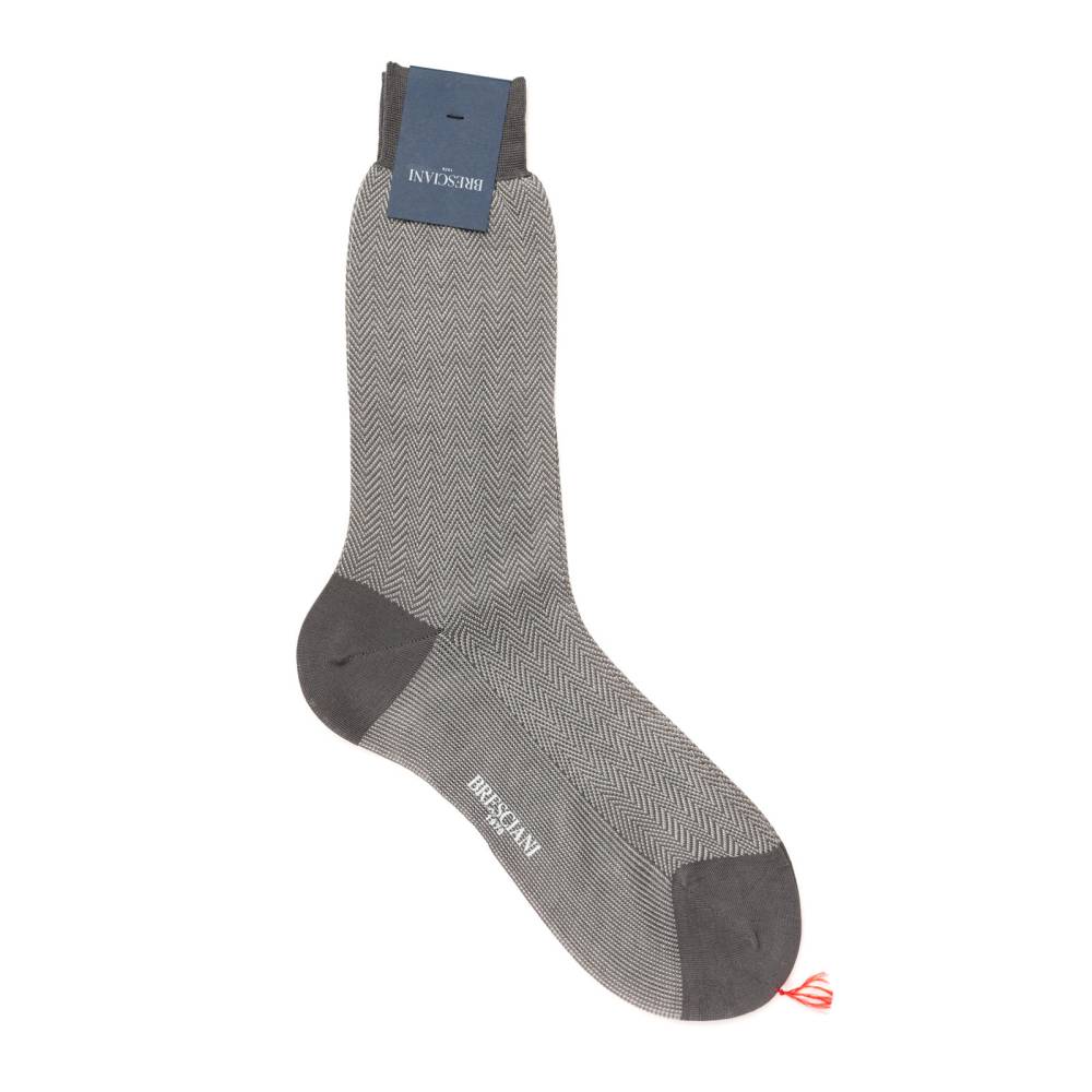 Мужские носки премиум-класса итальянского бренда Bresciani. Традиционный узор «ёлочка» (herringbone) серого цвета создан методом жаккардового плетения непосредственно в структуре ткани, что делает его долговечным и фактурным. Модель из фильдекосовой пряжи (Fil d'Écosse) смеси экстрадлинноволокнистого египетского хлопка Giza 45 и Giza 87 двойного кручения (2-ply). Плотность вязки в 240 игл, двойная мерсеризация и опаливание волокон придают полотну шелковистый блеск, гладкость и прочность. Выполненный вручную бесшовный мысок (Hand linked) исключает давление и гарантирует комфорт в любой обуви. Мерсеризованный хлопок обеспечивает идеальную терморегуляцию и подходит для весенне-летнего гардероба.
