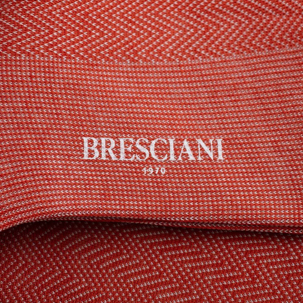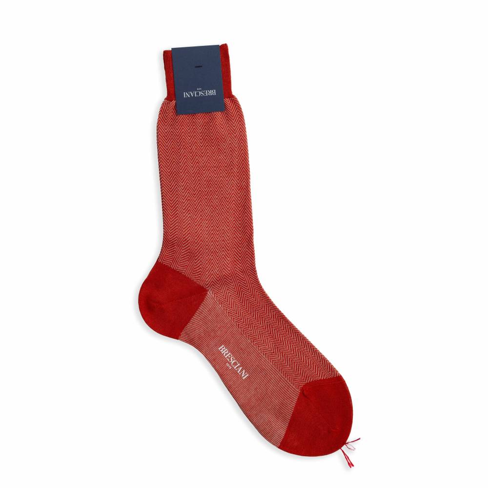 Мужские носки премиум-класса итальянского бренда Bresciani. Традиционный узор «ёлочка» (herringbone) оранжевого цвета создан методом жаккардового плетения непосредственно в структуре ткани, что делает его долговечным и фактурным. Модель из фильдекосовой пряжи (Fil d'Écosse) смеси экстрадлинноволокнистого египетского хлопка Giza 45 и Giza 87 двойного кручения (2-ply). Плотность вязки в 240 игл, двойная мерсеризация и опаливание волокон придают полотну шелковистый блеск, гладкость и прочность. Выполненный вручную бесшовный мысок (Hand linked) исключает давление и гарантирует комфорт в любой обуви. Мерсеризованный хлопок обеспечивает идеальную терморегуляцию и подходит для весенне-летнего гардероба.