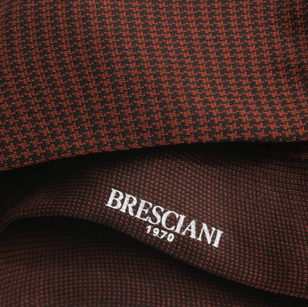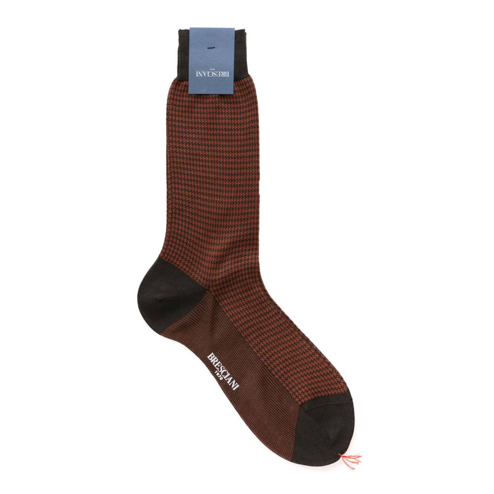 Мужские носки премиум-класса итальянской мануфактуры Bresciani. Узор «гусиная лапка» (houndstooth) тёмно-коричневого цвета создан методом жаккардового плетения непосредственно в структуре ткани, что делает его долговечным и фактурным. Модель из фильдекосовой пряжи (Fil d'Écosse) смеси экстрадлинноволокнистого египетского хлопка (Giza 45 и Giza 87) двойного кручения (2-ply). Плотность вязки в 240 игл, двойная мерсеризация и опаливание волокон придают полотну шелковистый блеск, гладкость и прочность. Выполненный вручную бесшовный мысок (Hand linked) исключает давление и гарантирует абсолютный комфорт в любой обуви. Тонкий мерсеризованный хлопок обеспечивает идеальную терморегуляцию.