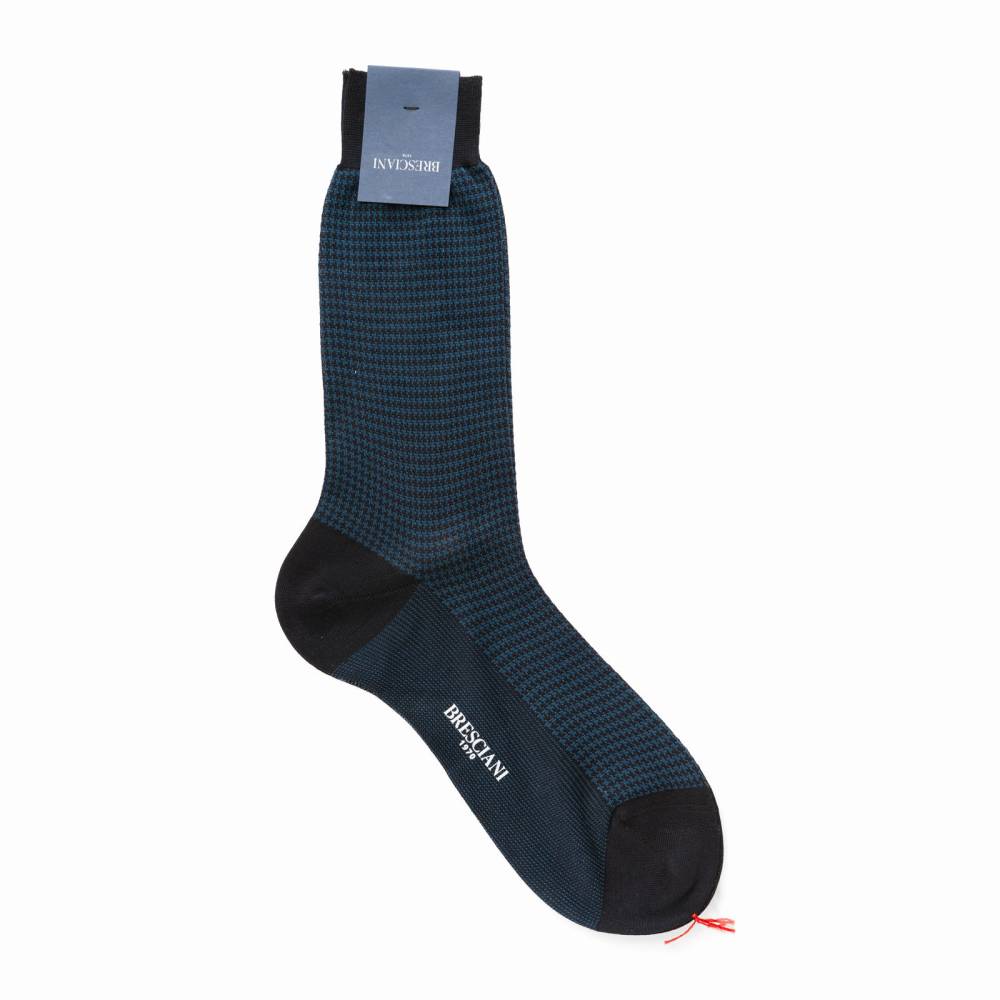 Мужские носки премиум-класса итальянской мануфактуры Bresciani. Узор «гусиная лапка» (houndstooth) тёмно-синего цвета создан методом жаккардового плетения непосредственно в структуре ткани, что делает его долговечным и фактурным. Модель из фильдекосовой пряжи (Fil d'Écosse) смеси экстрадлинноволокнистого египетского хлопка (Giza 45 и Giza 87) двойного кручения (2-ply). Плотность вязки в 240 игл, двойная мерсеризация и опаливание волокон придают полотну шелковистый блеск, гладкость и прочность. Выполненный вручную бесшовный мысок (Hand linked) исключает давление и гарантирует абсолютный комфорт в любой обуви. Тонкий мерсеризованный хлопок обеспечивает идеальную терморегуляцию.