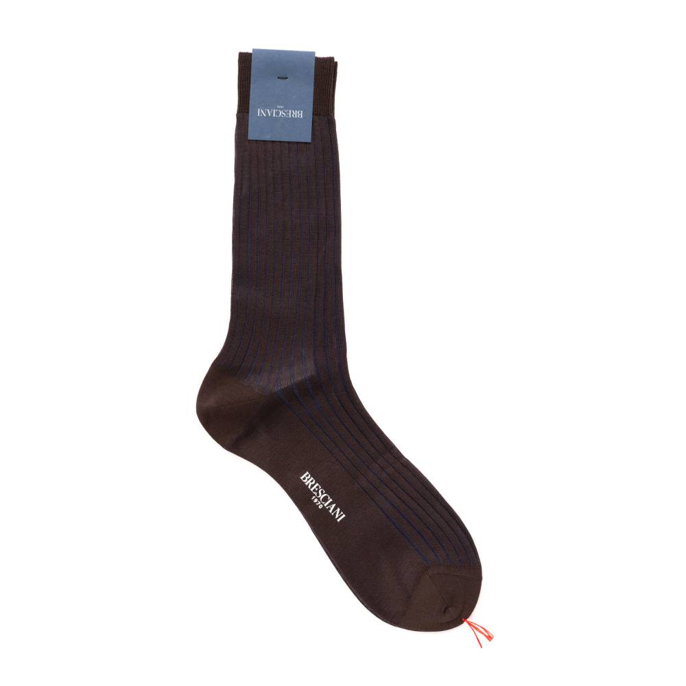 Тёмно-коричневые мужские носки премиум-класса итальянской марки Bresciani. Приятная на ощупь фильдекосовая пряжа сделана из экстрадлинноволокнистого египетского хлопка (смесь Giza 45 и Giza 87) двойного кручения. В процессе мерсеризации и опаливания с пряжи удаляются все свободные волокна, благодаря чему она становится гладкой и блестящей. Носки изготавливают на итальянской фабрике Bresciani на станках с 200 иглами и более и применением ручного труда. Мысок присоединён к основной части носка кеттельным швом, выполненным на специальной машинке: такой шов почти незаметен и не доставляет дискомфорта.