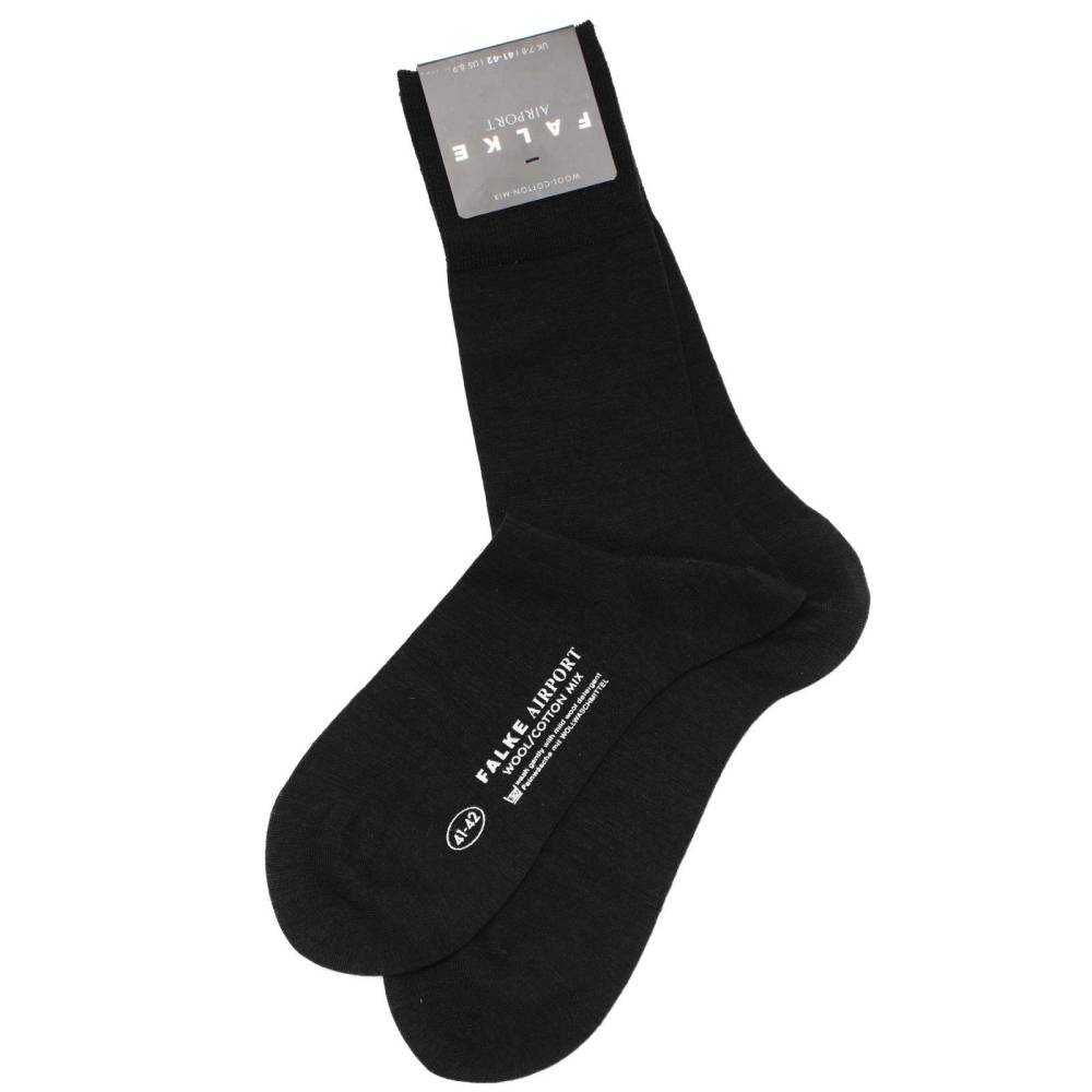 Классические носки для деловых людей Airport чёрного цвета немецкой фирмы Falke. Выполнены из высококачественного хлопка с внутренней стороны и мериносовой шерсти - с внешней. Носки отличаются высокой прочностью и износостойкостью: они прекрасно держат форму и не портятся после стирок. Шов на мысе выполнен вручную, а не на машинке, поэтому он мягкий и гладкий. В области стопы ткань более плотная, что создает усиление зон нагрузки.