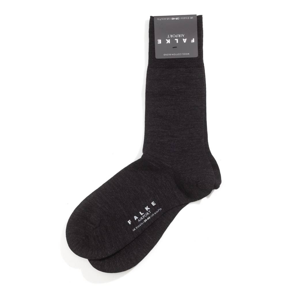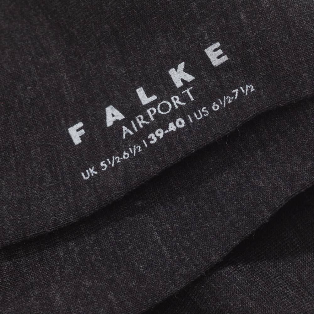 Классические носки для деловых людей Airport тёмно-серого цвета немецкой фирмы Falke. Выполнены из высококачественного хлопка с внутренней стороны и мериносовой шерсти - с внешней. Носки отличаются высокой прочностью и износостойкостью: они прекрасно держат форму и не портятся после стирок. Шов на мысе выполнен вручную, а не на машинке, поэтому он мягкий и гладкий. В области стопы ткань более плотная, что создает усиление зон нагрузки.
