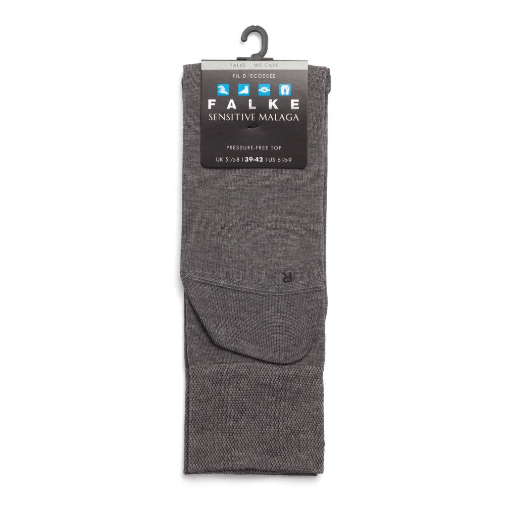 Носки Sensitive Malaga немецкой фирмы Falke созданы с учётом анатомических особенностей правой и левой стопы (маркировка R/L). Модель выполнена из хлопковых нитей (98% хлопок, 2% эластан) серого цвета, прошедших мерсеризацию. После такой обработки пряжа становится мягче и прочнее, а насыщенный оттенок приобретает благородный шёлковистый блеск. Особенность серии — комфортная манжета без давления, которая не сжимает ногу и не впивается в кожу. Благодаря отсутствию сдавливания носки не затрудняют кровообращение и не способствуют появлению отёков, что делает их идеальными для диабетиков и комфортными для длительного ношения в течение всего дня. Усиленные пятка и мыс защищены от нагрузок, а плоские швы ручной работы исключают натирание, позволяя сочетать модель как с деловыми, так и с повседневными образами.