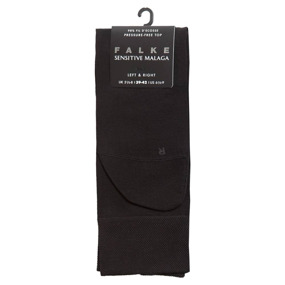 Носки чёрного цвета Sensitive Malaga немецкой фирмы Falke созданы с учётом анатомических особенностей: для правой и левой ноги (маркировка R/L). Модель выполнена из первоклассных хлопковых нитей, прошедших мерсеризацию - кратковременную обработку специальным раствором. После такой обработки нити становятся мягче, прочнее, симметричнее, а также приобретают шёлковистый блеск. Пятка и мыс дополнительно защищены от трения и нагрузок. Носки имеют широкую мягкую резинку, которая не сдавливает ногу. Шов на мысе выполнен вручную.